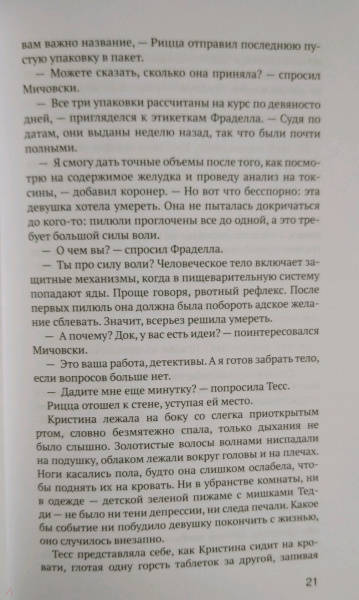ОписаниеФотомодель Кристина Бартлетт знаменита, богата и счастлива. У нее замечательные родители и любящий молодой человек, за которого она вскоре выйдет замуж. Но внезапно эта молодая особа кончает с собой. Прибывшие на место преступления полицейские уверены - это типичный суицид. Однако у специального агента ФБР Тесс Уиннет возникают сомнения.А вскоре она понимает, что ей предстоит вычислить и изловить очередного маньяка. Проблема только в том, что злодей не оставляет следов...Фотомодель Кристина Бартлетт знаменита, богата и счастлива. У нее замечательные родители и любящий молодой человек, за которого она вскоре выйдет замуж. Но внезапно эта молодая особа кончает с собой. Прибывшие на место преступления полицейские уверены - это типичный суицид. Однако у специального агента ФБР Тесс Уиннет возникают сомнения.А вскоре она понимает, что ей предстоит вычислить и изловить очередного маньяка. Проблема только в том, что злодей не оставляет следов...