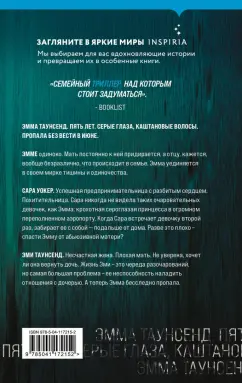 ОписаниеЭмма Таунсенд. Пять лет. Серые глаза, каштановые волосы. Пропала без вести в июне.Эмме одиноко. Мать постоянно к ней придирается, а отцу, кажется, вообще безразлично, что происходит в семье. Эмма уединяется в своем мирке тишины и одиночества.Сара Уокер. Успешная предпринимательница с разбитым сердцем. Похитительница.Сара никогда не видела таких очаровательных девочек, как Эмма: крохотная сероглазая принцесса в огромном переполненном аэропорту. Когда Сара встречает девочку второй раз, забирает ее с собой - подальше от дома. Разве это плохо - спасти Эмму от абьюзивной матери? Эми Таунсенд. Несчастная жена. Плохая мать. Не уверена, хочет ли она вернуть дочь.Жизнь Эми - это череда разочарований, но самая большая проблема - ее неспособность наладить отношения с дочерью. А теперь Эмма бесследно пропала.*В книгах Inspiria, выпущенных в 2020 году, доступен к прослушиванию только пробный фрагмент аудио. В книгах, выпущенных позже 2020 года, мы предоставляем доступ к полной аудиоверсии.«Не ее дочь» — это провокационная история проблемного материнства, болезненной привязанности и похищения. Каждой своей книгой Риа Фрай бьет в самое сердце,