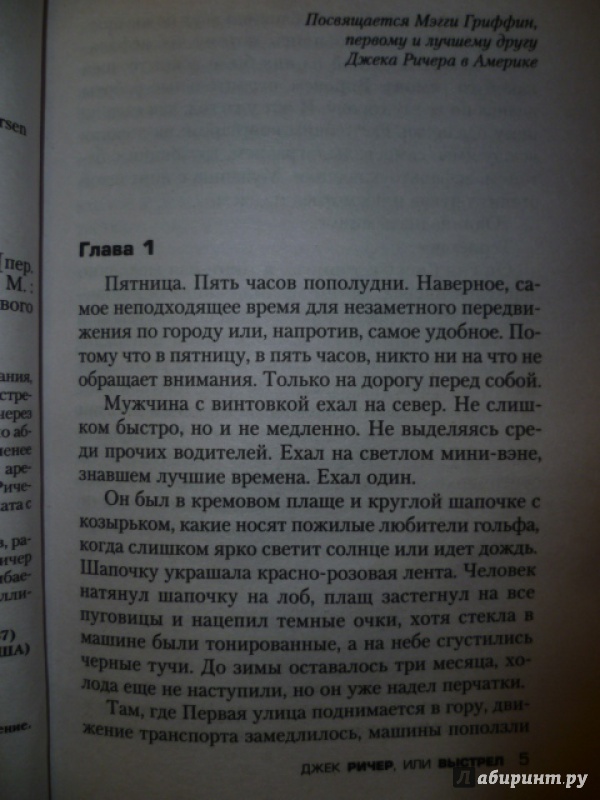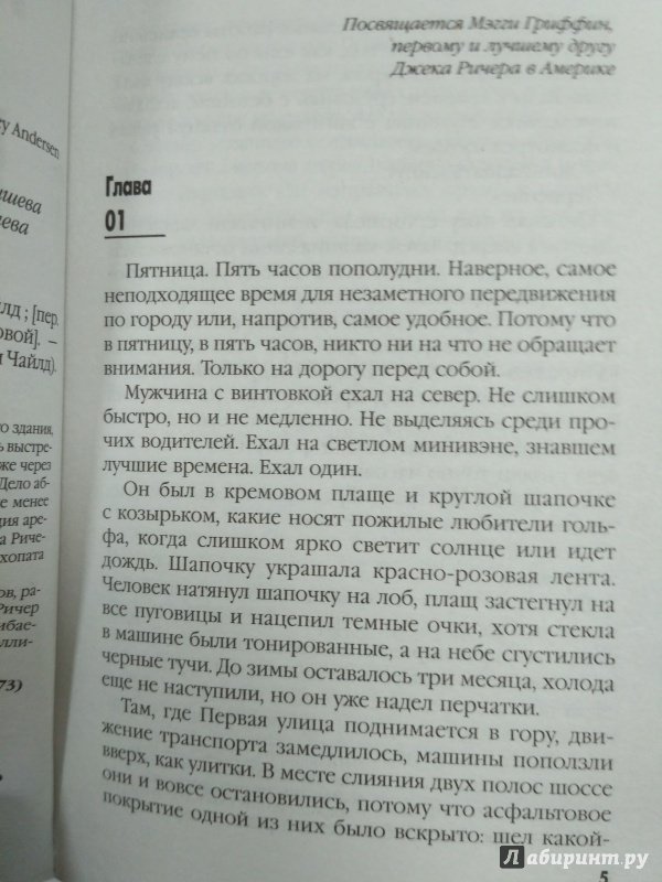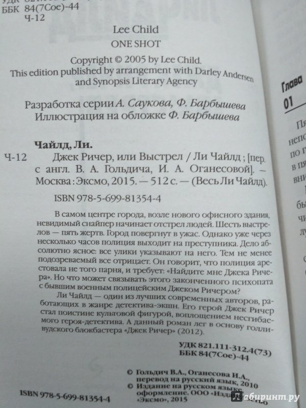 ОписаниеВ самом центре города, возле нового офисного здания, невидимый снайпер начинает отстрел людей. Шесть выстрелов - пять жертв. Город повергнут в ужас. Однако уже через несколько часов полиция выходит на преступника. Дело абсолютно ясное: все улики указывают на него. Тем не менее, подозреваемый все отрицает. Он говорит, что полиция арестовала не того парня, и требует: "Найдите мне Джека Ричера". Но что может связывать этого законченного психопата с бывшим военным полицейским Джеком Ричером?Ли Чайлд - один из лучших современных авторов, работающих в жанре детектива-экшн. Его герой Джек Ричер стал поистине культовой фигурой, воплощением несгибаемого героя-детектива. А данный роман лег в основу голливудского блокбастера "Джек Ричер" (2012).В самом центре города, возле нового офисного здания, невидимый снайпер начинает отстрел людей. Шесть выстрелов - пять жертв. Город повергнут в ужас. Однако уже через несколько часов полиция выходит на преступника. Дело абсолютно ясное: все улики указывают на него. Тем не менее, подозреваемый все отрицает. Он говорит, что полиция арестовала не того парня, и требует: "Найдите мне Джека Ричера". Но что может связывать этого законченного психопата с бывшим военным полицейским Джеком Ричером?Ли Чайлд - один из лучших современных авторов, работающих в жанре детектива-экшн. Его герой Джек Ричер стал поистине культовой фигурой, воплощением несгибаемого героя-детектива. А данный роман лег в основу голливудского блокбастера "Джек Ричер" (2012).