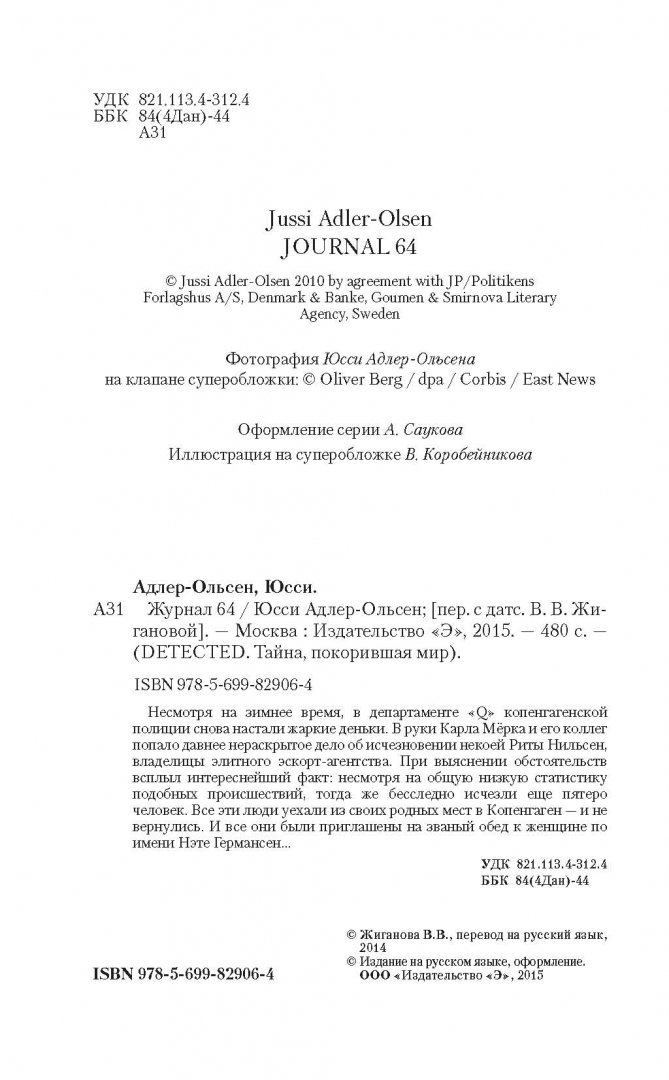 ---Юсси Адлер-Ольсен: Журнал 64Русская классическая и современная литератураДетектив. Остросюжетная литератураЗарубежная художественная литератураРусская художественная литератураФэнтезиДраматургияПоэзияПриключенияФантастикаЭпос и фольклорКлассическая прозаАфоризмыИсторическая прозаДетективыБасниСентиментальная прозаОтечественный боевикСовременная прозаМолодежная литератураЗарубежная классическая и современная литература