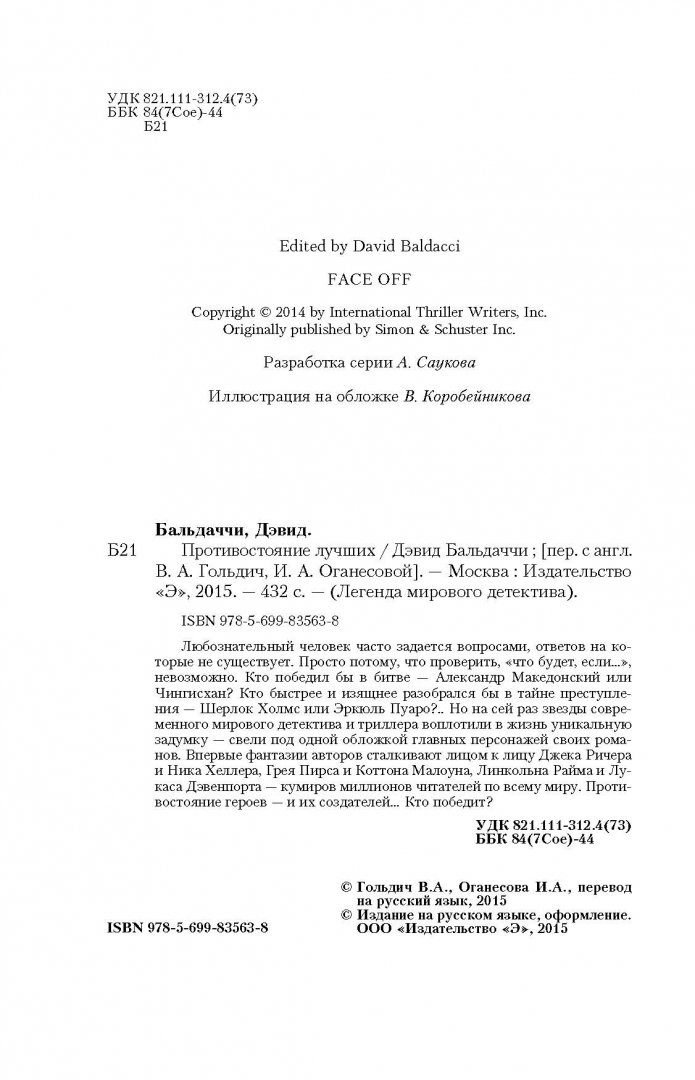 ОписаниеЛюбознательный человек часто задается вопросами, ответов на которые не существует. Просто потому, что проверить, «что будет, если…», невозможно. Кто победил бы в битве – Александр Македонский или Чингисхан? Кто быстрее и изящнее разобрался бы в тайне преступления – Шерлок Холмс или Эркюль Пуаро?.. Но на сей раз звезды современного мирового детектива и триллера воплотили в жизнь уникальную задумку – свели под одной обложкой главных персонажей своих романов. Впервые фантазии авторов сталкивают лицом к лицу Джека Ричера и Ника Хеллера, Грея Пирса и Коттона Малоуна, Линкольна Райма и Лукаса Дэвенпорта – кумиров миллионов читателей по всему миру. Противостояние героев – и их создателей… Кто победит?Автор-составитель: Дэвид Бальдаччи.Любознательный человек часто задается вопросами, ответов на которые не существует. Просто потому, что проверить, «что будет, если…», невозможно. Кто победил бы в битве – Александр Македонский или Чингисхан? Кто быстрее и изящнее разобрался бы в тайне преступления – Шерлок Холмс или Эркюль Пуаро?.. Но на сей раз звезды современного мирового детектива и триллера воплотили в жизнь уникальную задумку – свели под одной обложкой главных персонажей своих романов. Впервые фантазии авторов сталкивают лицом к лицу Джека Ричера и Ника Хеллера, Грея Пирса и Коттона Малоуна, Линкольна Райма и Лукаса Дэвенпорта – кумиров миллионов читателей по всему миру. Противостояние героев – и их создателей… Кто победит?Автор-составитель: Дэвид Бальдаччи.