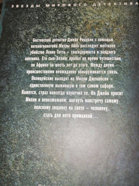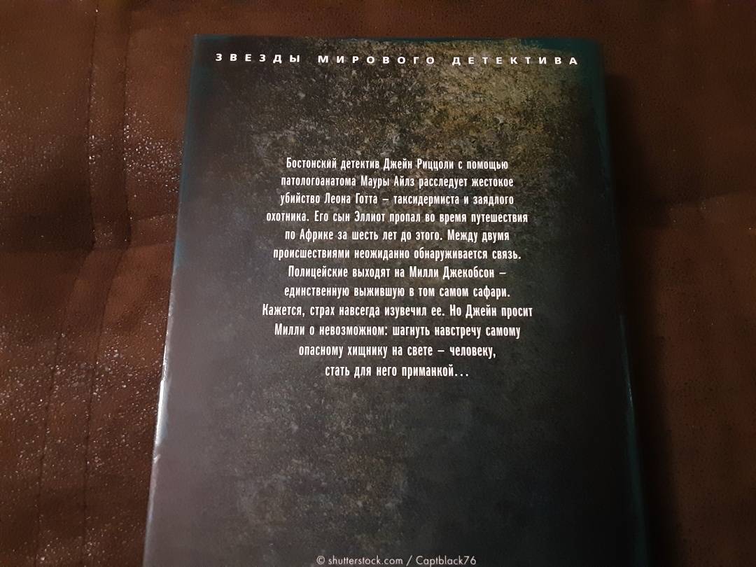 ОписаниеБостонский детектив Джейн Риццоли с помощью патологоанатома Мауры Айлз расследует жестокое убийство Леона Готта - таксидермиста и заядлого охотника. Его сын Эллиот пропал во время путешествия по Африке за шесть лет до этого. Между двумя происшествиями неожиданно обнаруживается связь. Полицейские выходят на Милли Джекобсон - единственную выжившую в том самом сафари. Кажется, страх навсегда изувечил ее. Но Джейн просит Милли о невозможном: шагнуть навстречу самому опасному хищнику на свете - человеку, стать для него приманкой…Бостонский детектив Джейн Риццоли с помощью патологоанатома Мауры Айлз расследует жестокое убийство Леона Готта - таксидермиста и заядлого охотника. Его сын Эллиот пропал во время путешествия по Африке за шесть лет до этого. Между двумя происшествиями неожиданно обнаруживается связь. Полицейские выходят на Милли Джекобсон - единственную выжившую в том самом сафари. Кажется, страх навсегда изувечил ее. Но Джейн просит Милли о невозможном: шагнуть навстречу самому опасному хищнику на свете - человеку, стать для него приманкой…
