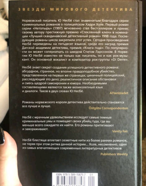 Объем, стр. 576 ISBN 978-5-389-15875-7 Автор Несбё Ю, Лавринайтис Екатерина Андреевна Переводчик Лавринайтис Екатерина Андреевна Серия Звезды мирового детектива (тв/обл.) Язык Русский Минимальный возраст 16+ Год издания книги 2021 Тип обложки Твердый переплет Иллюстрации Без иллюстраций Вес, г 600г Размеры 220х150х27 мм - Отзывы