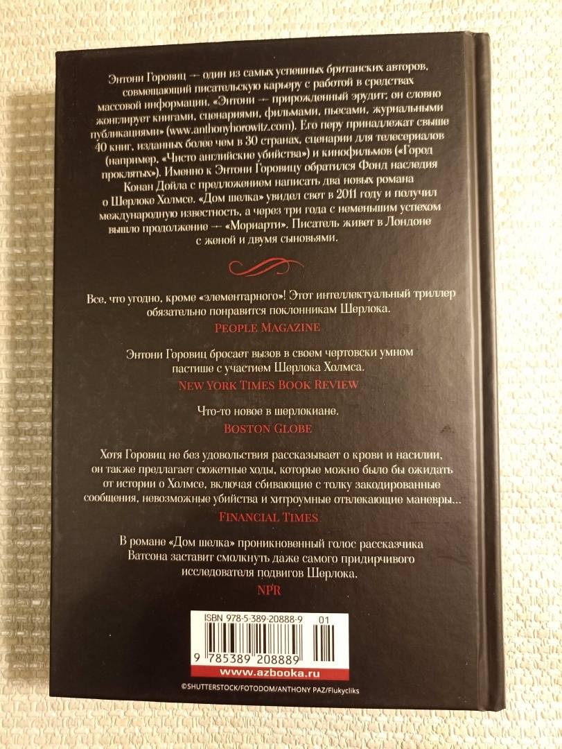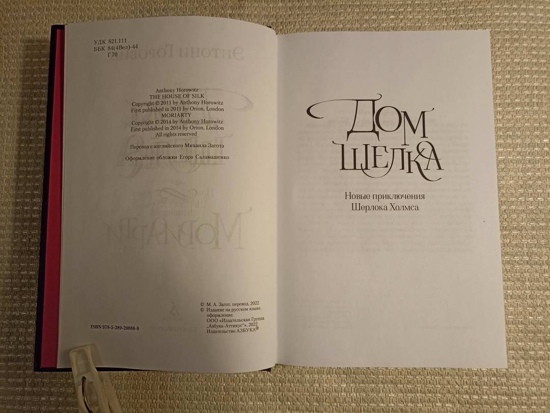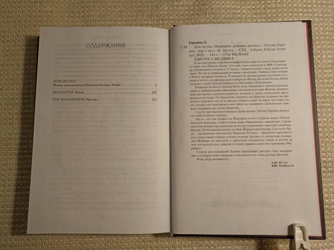 ОписаниеВ литературном и кинематографическом мире нет более популярного героя, чем Шерлок Холмс. Это имя стало сенсацией в 1890-х благодаря публикациям в журнале "Стрэнд", тиражи которого сразу выросли на треть. По числу экранизаций история о детективе с Бейкер-стрит попала в Книгу рекордов Гиннесса. О количестве литературных пастишей и говорить нечего, но официальное одобрение Фонда наследия Конан Дойла получил только Энтони Горовиц за свой роман "Дом шелка". В карьере великого сыщика было дело, связанное с такими чудовищными и скандальными событиями, что написать о нем Ватсон, неизменный рассказчик увлекательнейших историй о своем гениальном друге, решился не скоро. Он тщательно упаковал эти записки, отправил на хранение в надежное место и завещал открыть пакет не ранее, чем через сто лет, потому что спрятанная в нем тайна под названием "Дом шелка" угрожала подорвать все устои общества... Спустя три года после выхода "Дома шелка" Энтони Горовиц вернулся в мир великого сыщика. После того как профессор Мориарти исчез в бурных водах Рейхенбахского водопада, в преступном мире образовалась "вакансия". Среди многочисленных претендентов на это место возникает поистине зловещая фигура. Детективному агенту из Нью-Йорка и инспектору Скотленд-Ярда - преданному поклоннику Шерлока Холмса - предстоит проложить путь через самые темные уголки столицы Англии, от элегантных площадей Мейфэра до причалов и закоулков лондонских доков, в погоне за тем, кто решительно заявляет о своих правах в качестве преемника Мориарти... Список расследований Холмса продолжает рассказ "Три монархини", в котором повествование снова ведется от лица доктора Ватсона. Итак, игра начинается...СвернутьВ литературном и кинематографическом мире нет более популярного героя, чем Шерлок Холмс. Это имя стало сенсацией в 1890-х благодаря публикациям в журнале "Стрэнд", тиражи которого сразу выросли на треть. По числу экранизаций история о детективе с Бейкер-стрит попала в Книгу рекордов Гиннесса. О количестве литературных пастишей и говорить нечего, но официальное одобрение Фонда наследия Конан Дойла получил только Энтони Горовиц за свой роман "Дом шелка". В карьере великого сыщика было дело, связанное с такими чудовищными и скандальными событиями, что написать о нем Ватсон, неизменный рассказчик увлекательнейших историй о своем гениальном друге, решился не скоро. Он тщательно упаковал эти записки, отправил на хранение в надежное место и завещал открыть пакет не ранее, чем через сто лет, потому что спрятанная в нем тайна под названием "Дом шелка" угрожала подорвать все устои общества... Спустя три года после выхода "Дома шелка" Энтони Горовиц вернулся в мир великого сыщика. После того как профессор Мориарти исчез в бурных водах Рейхенбахского водопада, в преступном мире образовалась "вакансия". Среди многочисленных претендентов на это место возникает поистине зловещая фигура. Детективному агенту из Нью-Йорка и инспектору Скотленд-Ярда - преданному поклоннику Шерлока Холмса - предстоит проложить путь через самые темные уголки столицы Англии, от элегантных площадей Мейфэра до причалов и закоулков лондонских доков, в погоне за тем, кто решительно заявляет о своих правах в качестве преемника Мориарти... Список расследований Холмса продолжает рассказ "Три монархини", в котором 