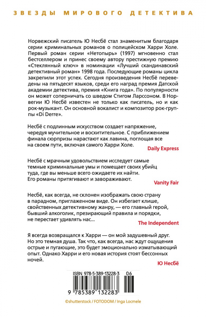Объем, стр. 512 ISBN 978-5-389-13228-3 Автор Несбё Ю, Лавринайтис Екатерина Андреевна Переводчик Лавринайтис Екатерина Андреевна Серия Звезды мирового детектива (тв/обл.) Язык Русский Минимальный возраст 18+ Год издания книги 2023 Тип обложки Твердый переплет Иллюстрации Без иллюстраций Вес, г 546г Размеры 217х149х23 мм - Отзывы