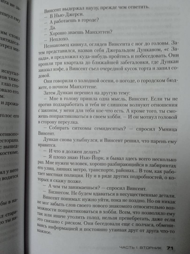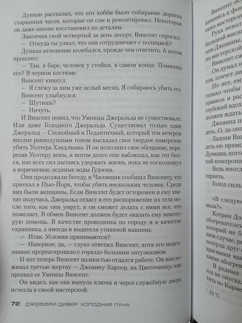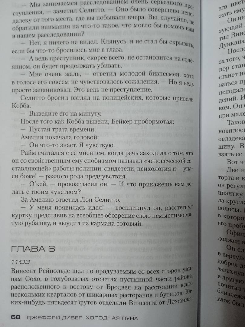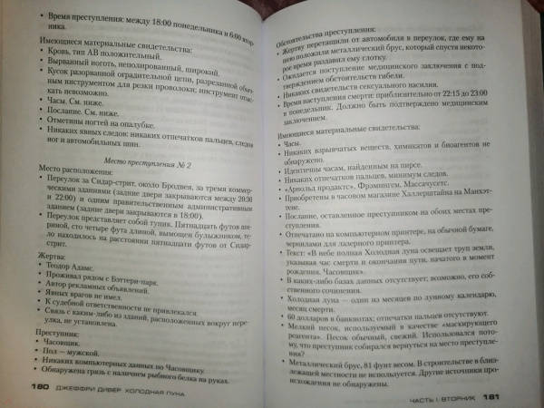 ОписаниеВ Нью-Йорке начал орудовать серийный убийца, и у него очевидные планы на будущее. Он одержим точным подсчетом времени и называет себя Часовщиком. Последние минуты жизни его жертв отсчитывают старинные часы с изображенной на циферблате луной, которые он оставляет на месте преступления, и это единственная зацепка. Гениальный криминалист Линкольн Райм, прикованный к инвалидному креслу, вместе со своей ученицей и помощницей Амелией Сакс берется за расследование этого необычного дела. На сей раз в команде детективов появляется новый сильный игрок, Кэтрин Дэнс, полицейский психолог, специалист по кинесике — языку тела, ведь «самыми опасными преступниками, как правило, бывают те, чьи мотивы сложно понять». Но логика преступника неуловима, как и он сам, непредсказуемый, просчитывающий каждый свой шаг и каждую секунду в жутких сценариях убийств...В Нью-Йорке начал орудовать серийный убийца, и у него очевидные планы на будущее. Он одержим точным подсчетом времени и называет себя Часовщиком. Последние минуты жизни его жертв отсчитывают старинные часы с изображенной на циферблате луной, которые он оставляет на месте преступления, и это единственная зацепка. Гениальный криминалист Линкольн Райм, прикованный к инвалидному креслу, вместе со своей ученицей и помощницей Амелией Сакс берется за расследование этого необычного дела. На сей раз в команде детективов появляется новый сильный игрок, Кэтрин Дэнс, полицейский психолог, специалист по кинесике — языку тела, ведь «самыми опасными преступниками, как правило, бывают те, чьи мотивы сложно понять». Но логика преступника неуловима, как и он сам, непредсказуемый, просчитывающий каждый свой шаг и каждую секунду в жутких сценариях убийств...