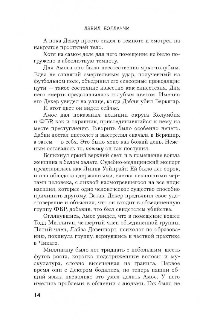 ОписаниеЖуткая травма головы, полученная на футбольном поле, не только оборвала спортивную карьеру Амоса Декера. Теперь он - обладатель абсолютной памяти и способен запоминать буквально все, что когда-либо видел или слышал. Что ж, внезапно обретенная суперспособность пришлась как нельзя кстати для его новой работы - службы в полиции, а затем в ФБР.Обычно команде, в которой работал Амос, поручали старые запутанные дела. Но внезапно на их головы свалился самый что ни на есть "свежак". А все потому, что Декер, идя утром на службу, стал свидетелем сразу двух смертей. Какой-то мужчина, находясь прямо у входа в здание Главного управления ФБР, застрелил идущую мимо женщину, а затем пустил пулю себе в голову…Жуткая травма головы, полученная на футбольном поле, не только оборвала спортивную карьеру Амоса Декера. Теперь он - обладатель абсолютной памяти и способен запоминать буквально все, что когда-либо видел или слышал. Что ж, внезапно обретенная суперспособность пришлась как нельзя кстати для его новой работы - службы в полиции, а затем в ФБР.Обычно команде, в которой работал Амос, поручали старые запутанные дела. Но внезапно на их головы свалился самый что ни на есть "свежак". А все потому, что Декер, идя утром на службу, стал свидетелем сразу двух смертей. Какой-то мужчина, находясь прямо у входа в здание Главного управления ФБР, застрелил идущую мимо женщину, а затем пустил пулю себе в голову…