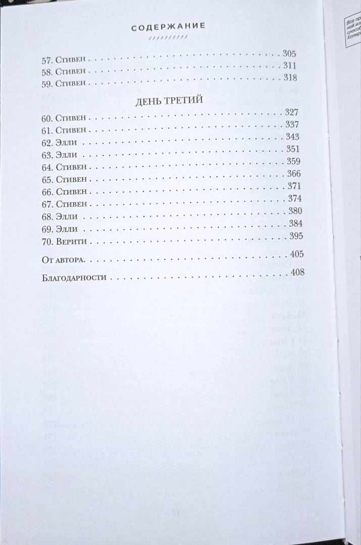 ОписаниеКошки-мышки на выживание - как вам такая "романтика"? Стивен - уважаемый профессор. Элли - подающая надежды студентка, получает ученую степень в университете. Элли и Стивен уезжают из Нью-Йорка, где на них всегда обращены сотни глаз, в романтический отпуск в уединенный дом на природе. Их ждут долгие горячие ночи и возможность лучше узнать друг друга. Ну… таков был план. Но ночью начинается сильный снегопад, а с ним приходит понимание - и Элли, и Стивен скрывают друг от друга кое-что важное. Настолько, что один из них не переживет эту ночь. "Восхитительно". - Гиллиан Флин, автор бестселлера "Исчезнувшая" "Прекрасно, пугающе и смело. Освободите время для чтения, эта книга вас зацепит". - Крис Уитакер, автор бестселлера "Мы начинаем в конце" "Любителям психологических триллеров просто необходимо обратить внимание на эту книгу. А уж если вам нравится мотив возмездия…" - BooklistКошки-мышки на выживание - как вам такая "романтика"? Стивен - уважаемый профессор. Элли - подающая надежды студентка, получает ученую степень в университете. Элли и Стивен уезжают из Нью-Йорка, где на них всегда обращены сотни глаз, в романтический отпуск в уединенный дом на природе. Их ждут долгие горячие ночи и возможность лучше узнать друг друга. Ну… таков был план. Но ночью начинается сильный снегопад, а с ним приходит понимание - и Элли, и Стивен скрывают друг от друга кое-что важное. Настолько, что один из них не переживет эту ночь. "Восхитительно". - Гиллиан Флин, автор бестселлера "Исчезнувшая" "Прекрасно, пугающе и смело. Освободите время для чтения, эта книга вас зацепит". - Крис Уитакер, автор бестселлера "Мы начинаем в конце" "Любителям психологических триллеров просто необходимо обратить внимание на эту книгу. А уж если вам нравится мотив возмездия…" - Booklist