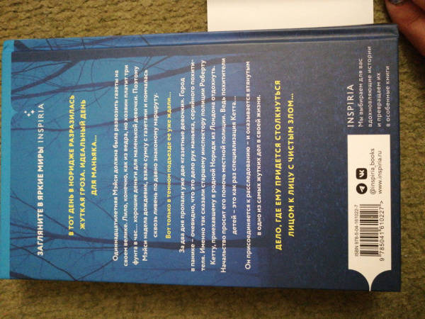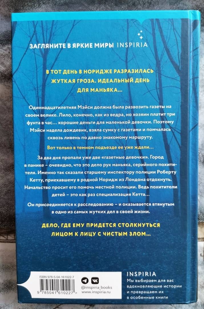 ОписаниеМеждународный бестселлерБестселлер Amazon #1 Они должны были разносить газеты с новостями.Но вместо этого сами оказались в заголовках новостей…В тот день в Норидже разразилась жуткая гроза. Идеальный день для маньяка…Одиннадцатилетняя Мэйси должна была развозить газеты на своем велике. Лило, конечно, как из ведра, но хозяин платит три фунта в час… хорошие деньги для маленькой девочки. Поэтому Мэйси надела дождевик, взяла сумку с газетами и помчалась сквозь ливень по давно знакомому маршруту.Вот только в темном подъезде ее уже ждали…За два дня пропали уже две "газетные девочки". Город в панике - очевидно, что это дело рук маньяка, серийного похитителя. Именно так сказали старшему инспектору полиции Роберту Кетту, приехавшему в родной Норидж из Лондона отдохнуть. Начальство просит его помочь местной полиции. Ведь похитители детей - это как раз специализация Кетта… Он присоединяется к расследованию - и оказывается втянутым в одно из самых жутких дел в своей жизни.Дело, где ему придется столкнуться лицом к лицу с чистым злом…СвернутьМеждународный бестселлерБестселлер Amazon #1 Они должны были разносить газеты с новостями.Но вместо этого сами оказались в заголовках новостей…В тот день в Норидже разразилась жуткая гроза. Идеальный день для маньяка…Одиннадцатилетняя Мэйси должна была развозить газеты на своем велике. Лило, конечно, как из ведра, но хозяин платит три фунта в час… хорошие деньги для маленькой девочки. Поэтому Мэйси надела дождевик, взяла сумку с газетами и помчалась сквозь ливень по давно знакомому маршруту.Вот только в темном подъезде ее уже ждали…За два дня пропали уже две "газетные девочки". Город в панике - очевидно, что это дело рук маньяка, серийного похитителя. Именно так сказали старшему инспектору полиции Роберту Кетту, приехавшему в родной Норидж из Лондона отдохнуть. Начальство просит его помочь местной полиции. Ведь похитители детей - это как раз специализация Кетта… Он присоединяется к расследованию - и оказывается втянутым в одно из самых жутких дел в своей жизни.Дело, где ему придется столкнуться лицом к лицу с чистым злом…СвернутьСвернуть