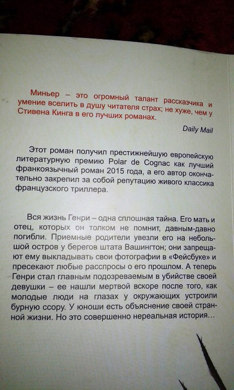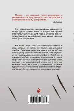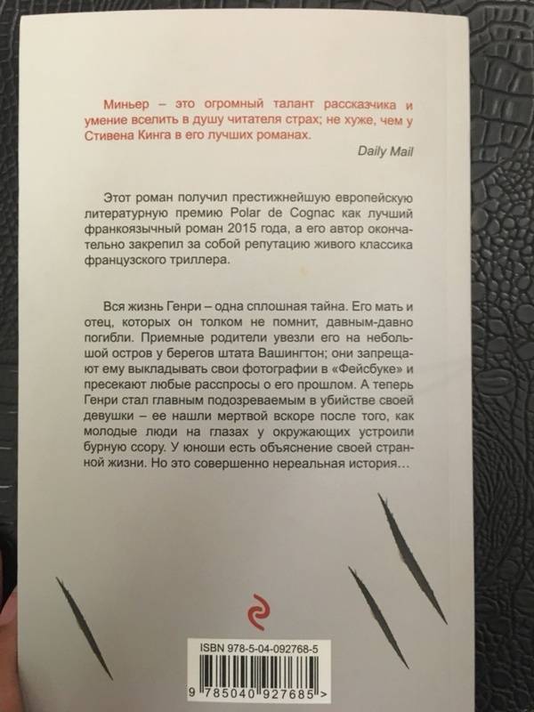 ОписаниеЭтот роман получил престижнейшую европейскую литературную премию Polar de Cognac как лучший франкоязычный роман 2015 года, а его автор окончательно закрепил за собой репутацию живого классика французского триллера.Вся жизнь Генри - одна сплошная тайна. Его мать и отец, которых он толком не помнит, давным-давно погибли. Приемные родители увезли его на небольшой остров у берегов штата Вашингтон; они запрещают ему выкладывать свои фотографии в "Фейсбуке" и пресекают любые расспросы о его прошлом. А теперь Генри стал главным подозреваемым в убийстве своей девушки - ее нашли мертвой вскоре после того, как молодые люди на глазах у окружающих устроили бурную ссору. У юноши есть объяснение своей странной жизни. Но это совершенно нереальная история…Этот роман получил престижнейшую европейскую литературную премию Polar de Cognac как лучший франкоязычный роман 2015 года, а его автор окончательно закрепил за собой репутацию живого классика французского триллера.Вся жизнь Генри - одна сплошная тайна. Его мать и отец, которых он толком не помнит, давным-давно погибли. Приемные родители увезли его на небольшой остров у берегов штата Вашингтон; они запрещают ему выкладывать свои фотографии в "Фейсбуке" и пресекают любые расспросы о его прошлом. А теперь Генри стал главным подозреваемым в убийстве своей девушки - ее нашли мертвой вскоре после того, как молодые люди на глазах у окружающих устроили бурную ссору. У юноши есть объяснение своей странной жизни. Но это совершенно нереальная история…