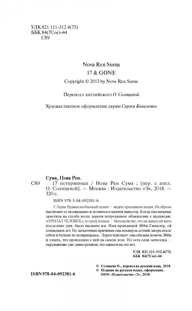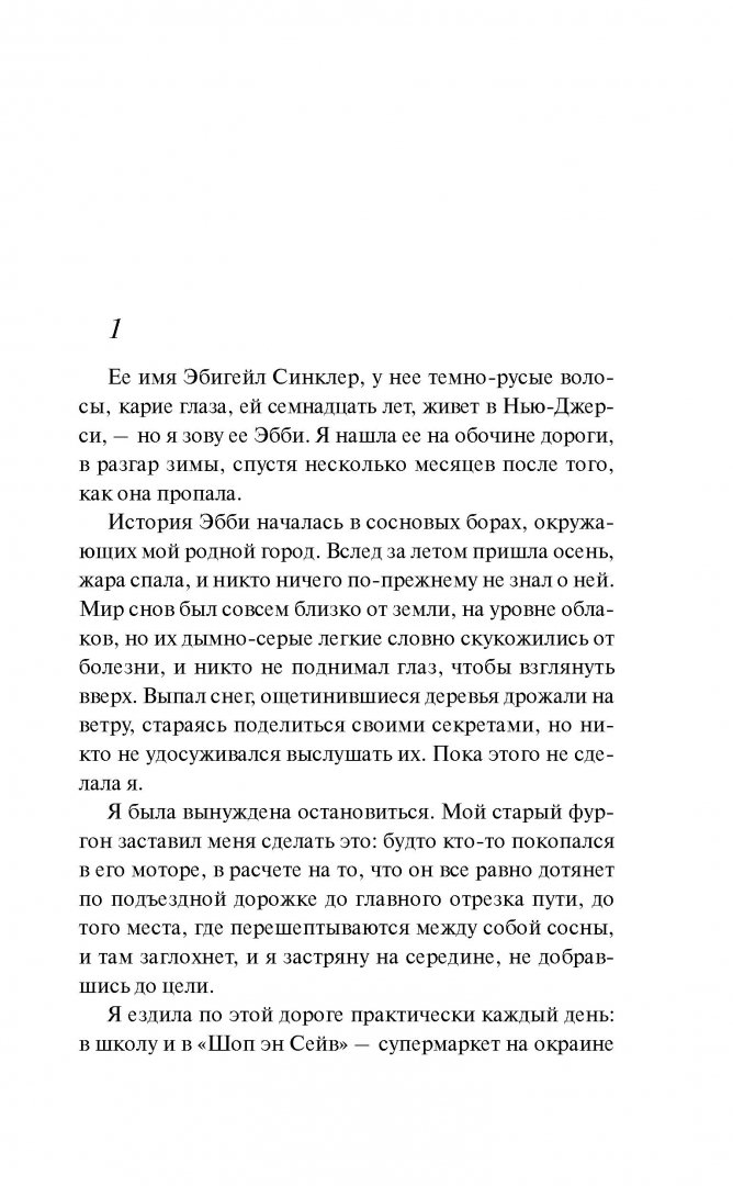 ОписаниеУ Лорен Вудман необычный талант - видеть пропавших людей. Их образы настигают ее неожиданно и остаются в памяти навсегда. Когда она впервые заметила на столбе возле дороги потрепанное объявление с надписью: "Пропал человек", то сразу поняла - беспокойство, что не давало ей жить последние дни, было вызвано им. Имя пропавшей Эбби Синклер, ей семнадцать лет. По загадочным причинам она покинула летний лагерь после отбоя и больше не возвращалась. Лорен чувствует: она обязана помочь Эбби и узнать, что произошло с ней на самом деле. Но есть одна загвоздка - окружающие уже давно решили, что шансов на это нет.У Лорен Вудман необычный талант - видеть пропавших людей. Их образы настигают ее неожиданно и остаются в памяти навсегда. Когда она впервые заметила на столбе возле дороги потрепанное объявление с надписью: "Пропал человек", то сразу поняла - беспокойство, что не давало ей жить последние дни, было вызвано им. Имя пропавшей Эбби Синклер, ей семнадцать лет. По загадочным причинам она покинула летний лагерь после отбоя и больше не возвращалась. Лорен чувствует: она обязана помочь Эбби и узнать, что произошло с ней на самом деле. Но есть одна загвоздка - окружающие уже давно решили, что шансов на это нет.