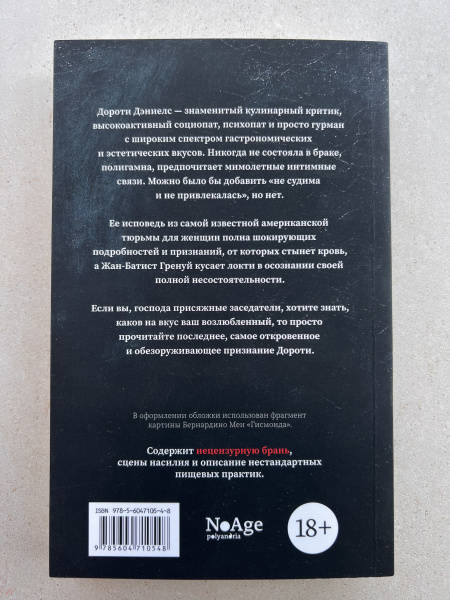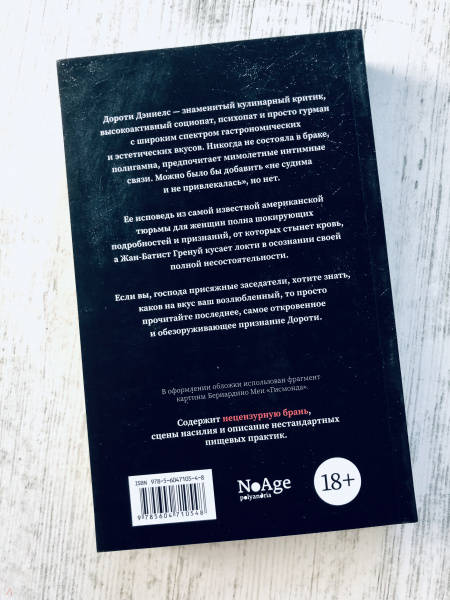 ОписаниеДороти Дэниелc - знаменитый кулинарный критик, высокоактивный социопат, психопат и просто гурман с широким спектром гастрономических и эстетических вкусов. Никогда не состояла в браке, полигамна, предпочитает мимолетные интимные связи. Можно было бы добавить "не судима и не привлекалась", но нет. Ее исповедь из самой известной американской тюрьмы для женщин полна шокирующих подробностей и признаний, от которых стынет кровь, а Жан-Батист Гренуй кусает локти в осознании своей полной несостоятельности. Если вы, господа присяжные заседатели, хотите знать, каков на вкус ваш возлюбленный, то просто прочитайте последнее, самое откровенное и обезоруживающее признание Дороти.Дороти Дэниелc - знаменитый кулинарный критик, высокоактивный социопат, психопат и просто гурман с широким спектром гастрономических и эстетических вкусов. Никогда не состояла в браке, полигамна, предпочитает мимолетные интимные связи. Можно было бы добавить "не судима и не привлекалась", но нет. Ее исповедь из самой известной американской тюрьмы для женщин полна шокирующих подробностей и признаний, от которых стынет кровь, а Жан-Батист Гренуй кусает локти в осознании своей полной несостоятельности. Если вы, господа присяжные заседатели, хотите знать, каков на вкус ваш возлюбленный, то просто прочитайте последнее, самое откровенное и обезоруживающее признание Дороти.