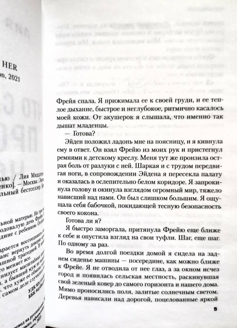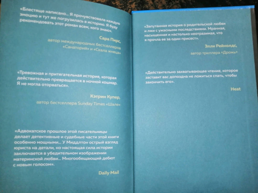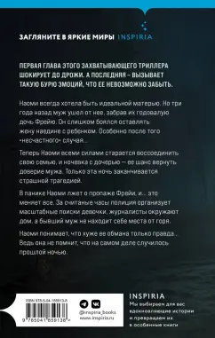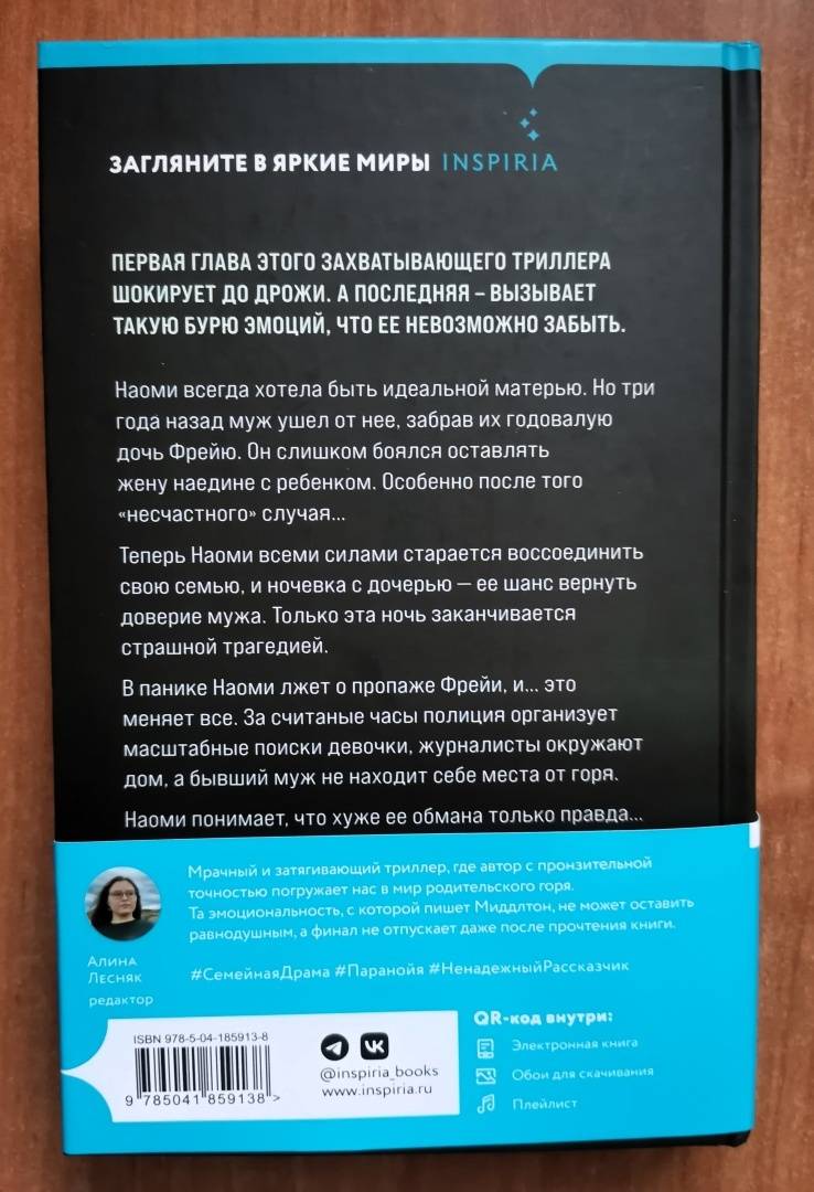 ОписаниеПервая глава этого захватывающего триллера шокирует до дрожи. А последняя - вызывает такую бурю эмоций, что ее невозможно забыть. "Я очень старалась вспомнить события той ночи. Вспомнить хоть что-нибудь: крик в темноте, как Фрейя зовет меня… Ничего. Сплошная темнота". Наоми всегда хотела быть идеальной матерью. Но три года назад муж ушел от нее, забрав их годовалую дочь Фрейю. Он слишком боялся оставлять жену наедине с ребенком. Особенно после того "несчастного" случая… Теперь Наоми всеми силами старается воссоединить свою семью, и ночевка с дочерью - ее шанс вернуть доверие мужа. Только эта ночь заканчивается страшной трагедией. В панике Наоми лжет о пропаже Фрейи, и… это меняет все. За считаные часы полиция организует масштабные поиски девочки, журналисты окружают дом, а бывший муж не находит себе места от горя. Наоми понимает, что хуже ее обмана только правда… Ведь она не помнит, что на самом деле случилось прошлой ночью. "Блестяще написано… Я прочувствовала каждую эмоцию и тут же погрузилась в сюжет. Я буду рекомендовать этот роман всем, кого знаю". - Сара Пирс, автор международных бестселлеров "Санаторий" и "Скала жнеца" "Тревожная и притягательная - история, которая действительно превращается в ночные кошмары. Я не могла оторваться". - Кэтрин Купер, автор бестселлера Sunday Times "Шале" "Адвокатское прошлое этой писательницы делает детективные и судебные части этой книги особенно мощными… У Миддлтон острый взгляд юриста на детали, но настоящая сила истории заключается в убедительном изображении материнской любви… многообещающий дебют с новым голосом". - Daily Mail "Запутанная история о родительской любви и лжи с ужасными последствиями. Мрачная, насыщенная и настолько неотразимая, что я прочла ее за один присест". - Элли Рейнолдс, автор триллера "Дрожь" "Действительно захватывающее чтение, которое заставит вас допоздна не ложиться спать, чтобы закончить его". - HeatСвернутьПервая глава этого захватывающего триллера шокирует до дрожи. А последняя - вызывает такую бурю эмоций, что ее невозможно забыть. "Я очень старалась вспомнить события той ночи. Вспомнить хоть что-нибудь: крик в темноте, как Фрейя зовет меня… Ничего. Сплошная темнота". Наоми всегда хотела быть идеальной матерью. Но три года назад муж ушел от нее, забрав их годовалую дочь Фрейю. Он слишком боялся оставлять жену наедине с ребенком. Особенно после того "несчастного" случая… Теперь Наоми всеми силами старается воссоединить свою семью, и ночевка с дочерью - ее шанс вернуть доверие мужа. Только эта ночь заканчивается страшной трагедией. В панике Наоми лжет о пропаже Фрейи, и… это меняет все. За считаные часы полиция организует масштабные поиски девочки, журналисты окружают дом, а бывший муж не находит себе места от горя. Наоми понимает, что хуже ее обмана только правда… Ведь она не помнит, что на самом деле случилось прошлой ночью. "Блестяще написано… Я прочувствовала каждую эмоцию и тут же погрузилась в сюжет. Я буду рекомендовать этот роман всем, кого знаю". - Сара Пирс, автор международных бестселлеров "Санаторий" и "Скала жнеца" "Тревожная и притягательная - история, которая действительно превращается в ночные кошмары. Я не могла оторваться". - Кэтрин Купер, автор бестселлера Sunday Times "Шале" "Адвокатское прошлое этой писательницы делает детективные и судебные части этой кни