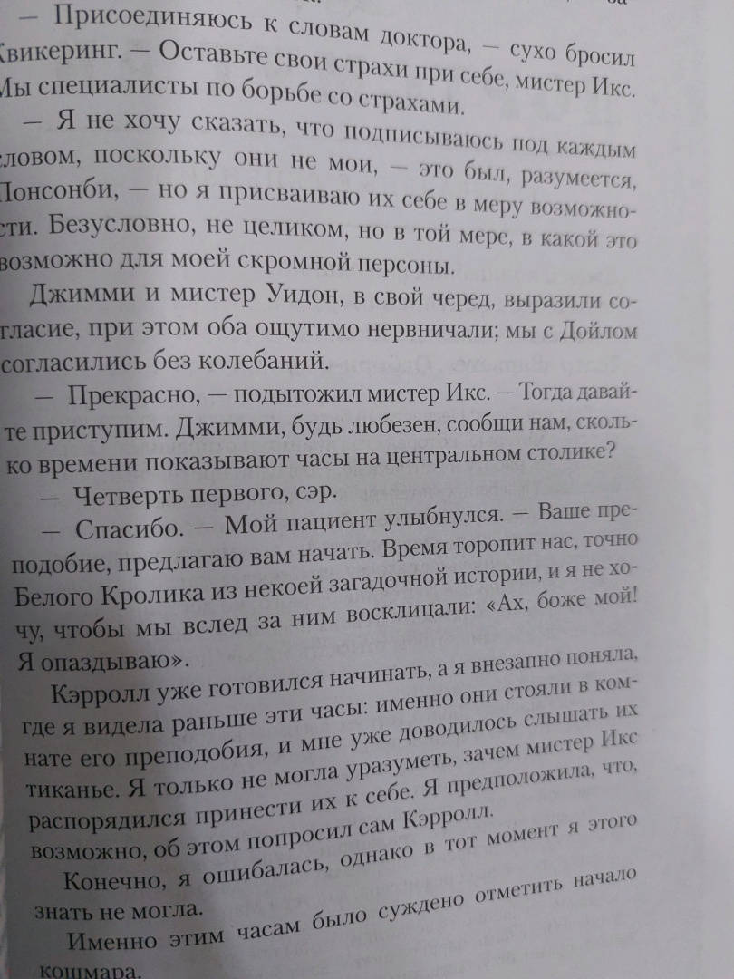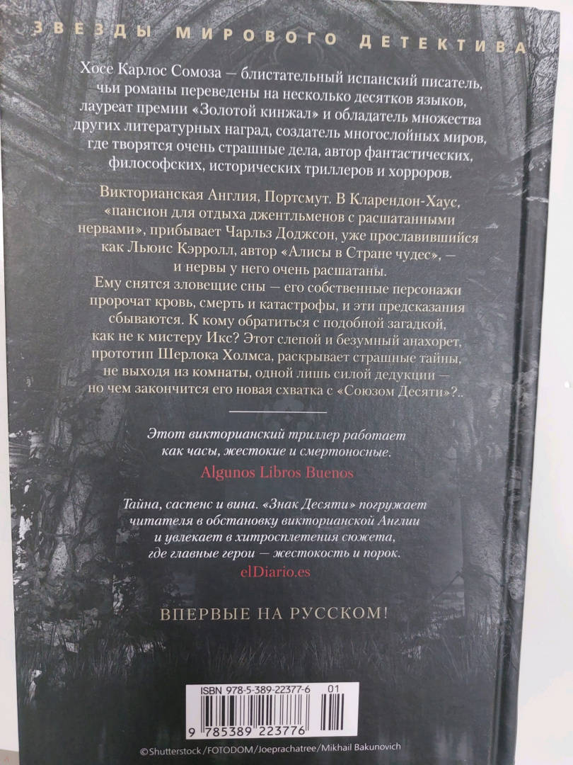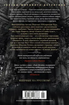 ОписаниеВикторианская Англия, Портсмут. В Кларендон-Хаус, "пансион для отдыха джентльменов с расшатанными нервами", прибывает новый постоялец - Чарльз Доджсон, уже прославившийся как Льюис Кэрролл, автор "Алисы в Стране чудес", - и нервы у него очень расшатаны. Чарльзу Доджсону снятся зловещие сны - его собственные персонажи пророчат ему и его знакомым кровь, смерть и катастрофы неясной природы, и эти предсказания снова и снова сбываются. К кому обратиться с подобной загадкой, как не к мистеру Икс, которому внятна подоплека любых человеческих поступков? Этот слепой и безумный анахорет, певец рациональности, прототип Шерлока Холмса, раскрывает страшные тайны, не выходя из комнаты, одной лишь силой дедукции - но чем закончится его новая схватка с "Союзом Десяти"? Хосе Карлос Сомоза - блистательный испанский писатель, чьи романы переведены на несколько десятков языков, лауреат премии "Золотой кинжал" и обладатель множества других литературных наград, создатель многослойных миров, где творятся очень страшные дела, автор фантастических, философских, исторических триллеров и хорроров. В "Знаке Десяти", продолжении "Этюда в черных тонах", возвращаются инфернально проницательный мистер Икс и его верная, ироничная, сильная и чувствительная медсестра Энн Мак-Кари, а вместе с ними в непредсказуемой интриге замешаны актеры, бутафоры и зрители жестоких подпольных театров, известные психиатры и, разумеется, Артур Конан Дойл. Впервые на русском!СвернутьВикторианская Англия, Портсмут. В Кларендон-Хаус, "пансион для отдыха джентльменов с расшатанными нервами", прибывает новый постоялец - Чарльз Доджсон, уже прославившийся как Льюис Кэрролл, автор "Алисы в Стране чудес", - и нервы у него очень расшатаны. Чарльзу Доджсону снятся зловещие сны - его собственные персонажи пророчат ему и его знакомым кровь, смерть и катастрофы неясной природы, и эти предсказания снова и снова сбываются. К кому обратиться с подобной загадкой, как не к мистеру Икс, которому внятна подоплека любых человеческих поступков? Этот слепой и безумный анахорет, певец рациональности, прототип Шерлока Холмса, раскрывает страшные тайны, не выходя из комнаты, одной лишь силой дедукции - но чем закончится его новая схватка с "Союзом Десяти"? Хосе Карлос Сомоза - блистательный испанский писатель, чьи романы переведены на несколько десятков языков, лауреат премии "Золотой кинжал" и обладатель множества других литературных наград, создатель многослойных миров, где творятся очень страшные дела, автор фантастических, философских, исторических триллеров и хорроров. В "Знаке Десяти", продолжении "Этюда в черных тонах", возвращаются инфернально проницательный мистер Икс и его верная, ироничная, сильная и чувствительная медсестра Энн Мак-Кари, а вместе с ними в непредсказуемой интриге замешаны актеры, бутафоры и зрители жестоких подпольных театров, известные психиатры и, разумеется, Артур Конан Дойл. Впервые на русском!СвернутьСвернуть