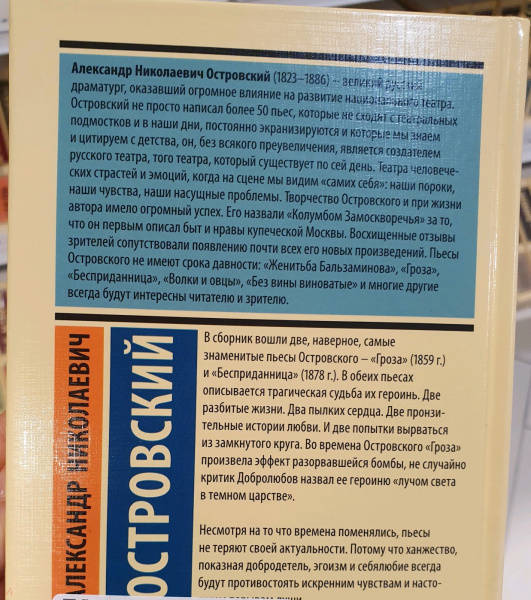 ОписаниеВ сборник вошли две, наверное, самые знаменитые пьесы Островского - "Гроза" (1859 г.) и "Бесприданница" (1878 г.). В обеих пьесах описывается трагическая судьба их героинь. Две разбитые жизни. Два пылких сердца. Две пронзительные истории любви. И две попытки вырваться из замкнутого круга. Во времена Островского "Гроза" произвела эффект разорвавшейся бомбы, не случайно критик Добролюбов назвал ее героиню "лучом света в темном царстве". Несмотря на то, что времена поменялись, пьесы не теряют своей актуальности. Потому что ханжество, показная добродетель, эгоизм и себялюбие всегда будут противостоять искренним чувствам и настоящим порывам души.В сборник вошли две, наверное, самые знаменитые пьесы Островского - "Гроза" (1859 г.) и "Бесприданница" (1878 г.). В обеих пьесах описывается трагическая судьба их героинь. Две разбитые жизни. Два пылких сердца. Две пронзительные истории любви. И две попытки вырваться из замкнутого круга. Во времена Островского "Гроза" произвела эффект разорвавшейся бомбы, не случайно критик Добролюбов назвал ее героиню "лучом света в темном царстве". Несмотря на то, что времена поменялись, пьесы не теряют своей актуальности. Потому что ханжество, показная добродетель, эгоизм и себялюбие всегда будут противостоять искренним чувствам и настоящим порывам души.