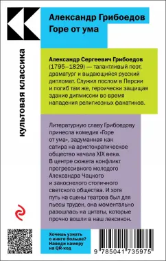 ОписаниеАлександр Сергеевич Грибоедов (1795-1829) - талантливый поэт, драматург и выдающийся русский дипломат. Служил послом в Персии и погиб там же, героически защищая здание дипмиссии во время нападения религиозных фанатиков. Литературную славу ему принесла комедия "Горе от ума", задуманная как сатира на аристократическое общество начала XIX века. В центре сюжета конфликт прогрессивного молодого Александра Чацкого и закостенелого столичного светского общества. И хотя путь на сцены театров был для пьесы труден, она моментально разошлась на цитаты, которые прочно вошли в наш лексикон.Александр Сергеевич Грибоедов (1795-1829) - талантливый поэт, драматург и выдающийся русский дипломат. Служил послом в Персии и погиб там же, героически защищая здание дипмиссии во время нападения религиозных фанатиков. Литературную славу ему принесла комедия "Горе от ума", задуманная как сатира на аристократическое общество начала XIX века. В центре сюжета конфликт прогрессивного молодого Александра Чацкого и закостенелого столичного светского общества. И хотя путь на сцены театров был для пьесы труден, она моментально разошлась на цитаты, которые прочно вошли в наш лексикон.