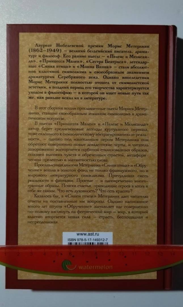 Объем, стр. 320 ISBN 978-5-17-149312-7 Автор Метерлинк Морис, Минский Николай, Вилькина Людмила Николаевна Переводчик Минский Николай, Вилькина Людмила Николаевна Серия Зарубежная классика Язык Русский Минимальный возраст 16+ Год издания книги 2022 Тип обложки Твердый переплет Иллюстрации Без иллюстраций Вес, г 262г Размеры 207х132х22 мм - Отзывы