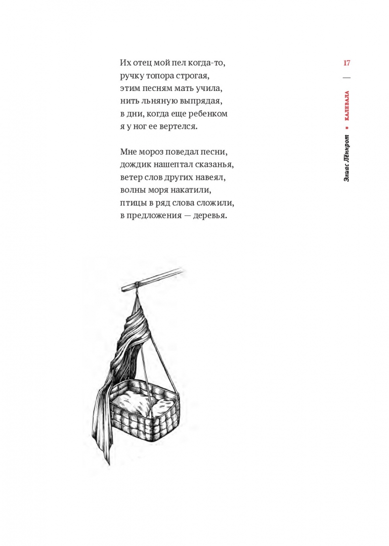 ОписаниеПамятник мировой литературы - карело-финская эпическая поэма "Калевала" Элиаса Лённрота (1802-1884) - публикуется в сокращенном варианте в переводе Армаса Мишина (1935-2018) и Эйно Киуру (1929-2015).Книга знакомит читателя с ключевыми сюжетами поэмы. Среди них мифы о сотворении мира из утиного яйца, рождении огня и железа, создании музыкального инструмента кантеле и волшебной мельницы сампо, о похищении солнца и луны и их освобождении.Темы и мотивы "Калевалы" по праву вошли в круг мирового культурного наследия: в литературе, живописи, музыке. Издание снабжено предисловием, списком главных героев поэмы, подробным содержанием, словарем забытых терминов.Первая редакция эпической поэмы Элиаса Лённрота была опубликована в 1835 году под названием "Калевала, или Старые руны Карелии о древних временах финского народа". Она состояла из 32 рун, а предисловие, скромно подписанное инициалами E. L., было датировано 28 февраля. Этот день и считается днем рождения "Калевалы". Поэма вызвала огромный интерес как в Финляндии, так и за ее пределами."Калевала" переведена более чем на 65 языков мира. Первый полный перевод на русский язык, не потерявший своей значимости и сегодня, был осуществлен в 1888 году Леонидом Бельским. В конце 90-х годов ХХ века петрозаводские переводчики Армас Мишин и Эйно Киуру выполнили новый полный перевод "Калевалы".В данном издании использован его сокращенный вариант, содержащий ключевые сюжеты эпической поэмы. Среди них мифы о первотворении, о создании сампо и борьбе за него, история о похищении солнца и луны и их освобождении. "Мы надеемся, что знакомство с основным сюжетом поэмы пробудит у юного читателя интерес к "Калевале" Элиаса Лённрота и к народной поэзии вообще", - писал Армас Мишин.Темы и мотивы "Калевалы" прочно вошли в круг мирового культурного наследия: в литературе, живописи, музыке. Они стали неотъемлемой частью мировой современной культуры.СвернутьПамятник мировой литературы - карело-финская эпическая поэма "Калевала" Элиаса Лённрота (1802-1884) - публикуется в сокращенном варианте в переводе Армаса Мишина (1935-2018) и Эйно Киуру (1929-2015).Книга знакомит читателя с ключевыми сюжетами поэмы. Среди них мифы о сотворении мира из утиного яйца, рождении огня и железа, создании музыкального инструмента кантеле и волшебной мельницы сампо, о похищении солнца и луны и их освобождении.Темы и мотивы "Калевалы" по праву вошли в круг мирового культурного наследия: в литературе, живописи, музыке. Издание снабжено предисловием, списком главных героев поэмы, подробным содержанием, словарем забытых терминов.Первая редакция эпической поэмы Элиаса Лённрота была опубликована в 1835 году под названием "Калевала, или Старые руны Карелии о древних временах финского народа". Она состояла из 32 рун, а предисловие, скромно подписанное инициалами E. L., было датировано 28 февраля. Этот день и считается днем рождения "Калевалы". Поэма вызвала огромный интерес как в Финляндии, так и за ее пределами."Калевала" переведена более чем на 65 языков мира. Первый полный перевод на русский язык, не потерявший своей значимости и сегодня, был осуществлен в 1888 году Леонидом Бельским. В конце 90-х годов ХХ века петрозаводские переводчики Армас Мишин и Эйно Киуру выполнили новый полный перевод "Калевалы".В данном издании использован его сокращенный вариант, содержащий ключевые сюжет