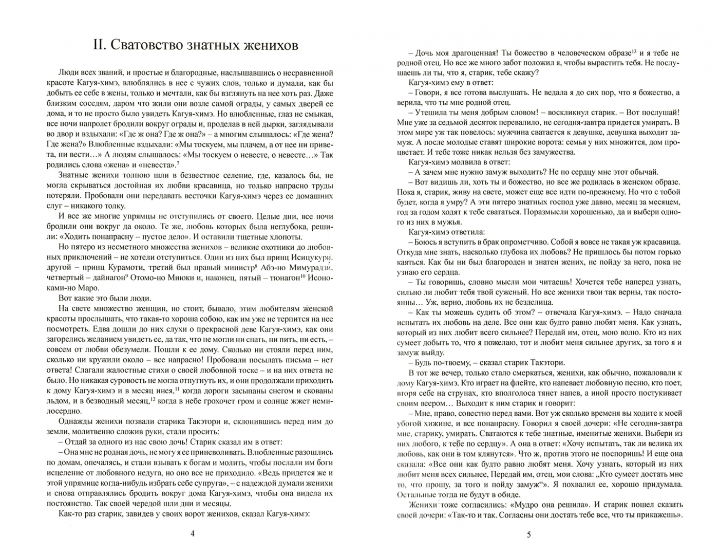 Описание«Повесть о старике Такэтори» («Такэтори-моногатари», или «Такэтори-но окина моногатари») была известна также под названием «Повесть о Кагуя-химэ». Автор неизвестен. Существует гипотеза, что создателем ее был Минамото-но Ситаго (911-983), известный поэт и ученый. Время создания в точности не установлено, но уже в XI веке «Повесть о старике Такэтори» считали «прародительницей всех романов». Видимо, она появилась в самом конце IX века или в начале десятого. С тех пор и до нашего времени повесть эта пользуется огромной популярностью среди японских читателей. Она оказала большое влияние на поэзию, роман, театр Японии. Изучение памятника началось уже в средние века и идет со все возрастающей интенсивностью, но многие спорные вопросы до сих пор еще не разрешены. В «Повести о старике Такэтори» сплетены сказочно-фантастические мотивы самого разнообразного происхождения: японские, китайские, индийские. Одни из них взяты из самой гущи японского фольклора, другие навеяны буддийскими и даосскими легендами. Бытовая основа содержит в себе моменты острой социальной сатиры. Возможно, что отдельные сатирические стрелы были пущены в знатнейших сановников из правящего рода Фудзивара. Структура «Такэтори-моногатари» уникальна и представляет собой большой интерес для истории и теории романа.Свернуть«Повесть о старике Такэтори» («Такэтори-моногатари», или «Такэтори-но окина моногатари») была известна также под названием «Повесть о Кагуя-химэ». Автор неизвестен. Существует гипотеза, что создателем ее был Минамото-но Ситаго (911-983), известный поэт и ученый. Время создания в точности не установлено, но уже в XI веке «Повесть о старике Такэтори» считали «прародительницей всех романов». Видимо, она появилась в самом конце IX века или в начале десятого. С тех пор и до нашего времени повесть эта пользуется огромной популярностью среди японских читателей. Она оказала большое влияние на поэзию, роман, театр Японии. Изучение памятника началось уже в средние века и идет со все возрастающей интенсивностью, но многие спорные вопросы до сих пор еще не разрешены. В «Повести о старике Такэтори» сплетены сказочно-фантастические мотивы самого разнообразного происхождения: японские, китайские, индийские. Одни из них взяты из самой гущи японского фольклора, другие навеяны буддийскими и даосскими легендами. Бытовая основа содержит в себе моменты острой социальной сатиры. Возможно, что отдельные сатирические стрелы были пущены в знатнейших сановников из правящего рода Фудзивара. Структура «Такэтори-моногатари» уникальна и представляет собой большой интерес для истории и теории романа.СвернутьСвернуть