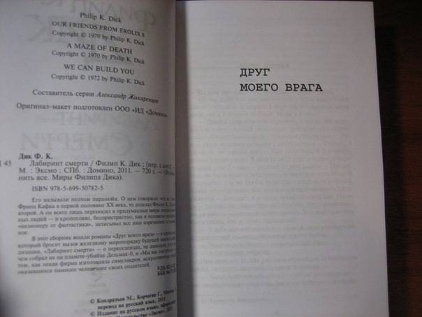 ОписаниеЕго называли поэтом паранойи. О нем говорили: что не успел Франц Кафка в первой половине XX века, то доделал Филип К. Дик во второй. А он всего лишь переносил в придуманные миры непридуманных людей - и кропотливо, беспристрастно, как и положено великому "визионеру от фантастики", записывал все ими изреченное и содеянное. В этот сборник вошли романы "Друг моего врага" - о пришельце, который бросит вызов железному миропорядку будущей земной цивилизации, "Лабиринт смерти" - о переселенцах, не знающих, кто и зачем собрал их на планете-убийце Дельмак-0, и "Мы вас построим!" - о том, как некая фирма изготовляла симулякров, искусственных людей, оказавшихся намного человечнее своих создателей.Его называли поэтом паранойи. О нем говорили: что не успел Франц Кафка в первой половине XX века, то доделал Филип К. Дик во второй. А он всего лишь переносил в придуманные миры непридуманных людей - и кропотливо, беспристрастно, как и положено великому "визионеру от фантастики", записывал все ими изреченное и содеянное. В этот сборник вошли романы "Друг моего врага" - о пришельце, который бросит вызов железному миропорядку будущей земной цивилизации, "Лабиринт смерти" - о переселенцах, не знающих, кто и зачем собрал их на планете-убийце Дельмак-0, и "Мы вас построим!" - о том, как некая фирма изготовляла симулякров, искусственных людей, оказавшихся намного человечнее своих создателей.