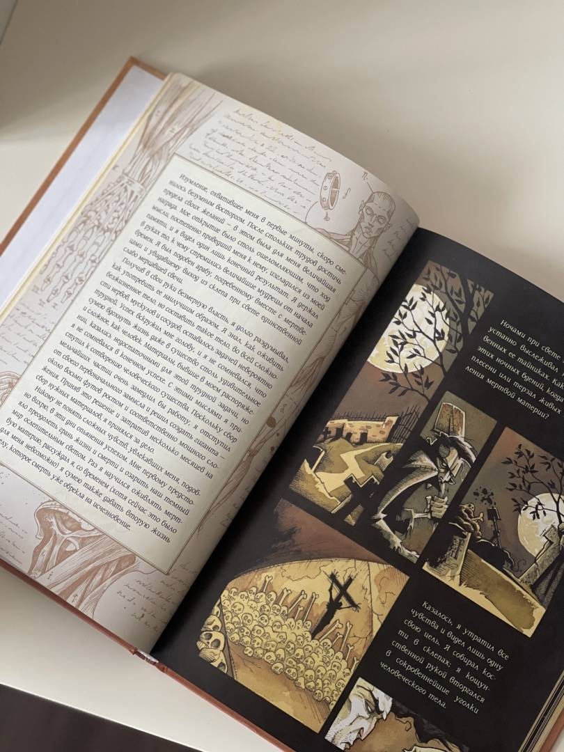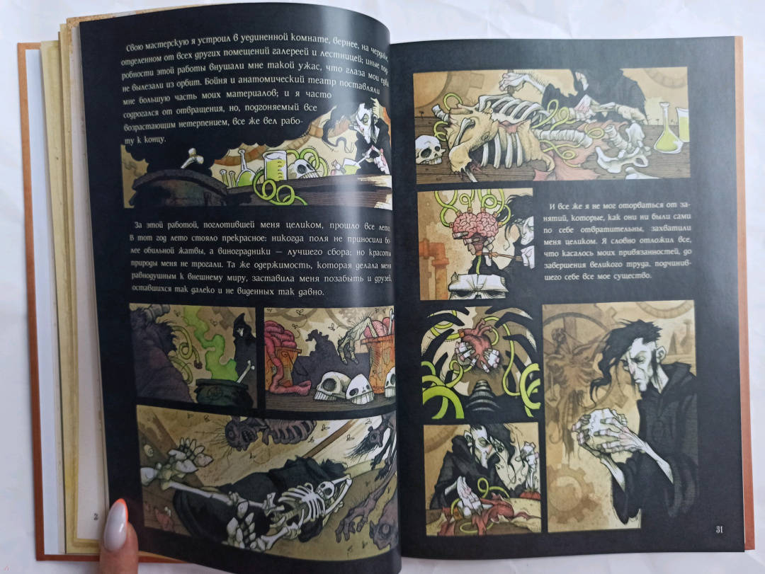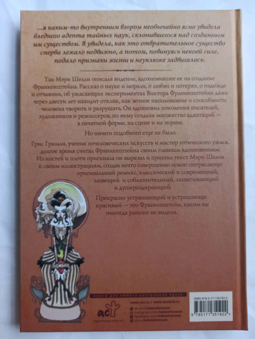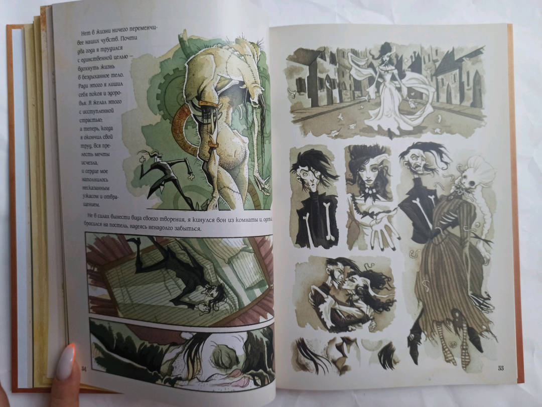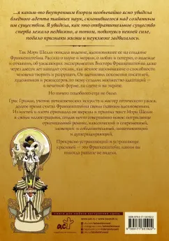 Описание…я каким-то внутренним взором необычайно ясно увидела бледного адепта тайных наук, склонившегося над созданным им существом. Я увидела, как это отвратительное существо сперва лежало недвижно, а потом, повинуясь некоей силе, подало признаки жизни и неуклюже задвигалось.Так Мэри Шелли описала видение, вдохновившее ее на создание Франкенштейна. Рассказ о науке и морали, о любви и потерях, о надежде и отчаянии, об ужасающих экспериментах Виктора Франкенштейна даже через двести лет находит отклик, каквечное напоминание о способности человека творить и разрушать. Он вдохновил поколения писателей, художников и режиссеров, по нему создали множество адаптаций — в печатной форме, на сцене и на экране.Но ничего подобного еще не было.Грис Гримли, ученик нечеловеческих искусств и мастер готического ужаса, долгое время считал Франкенштейна своим главным вдохновением. Из костей и плоти оригинала он вырезал и пришил текст Мэри Шелли к своим иллюстрациям, создав нечто совершенно новое: потрясающе оригинальный ремикс, классический и современный, зловещий и соблазнительный, захватывающий и душераздирающий.Прекрасно устрашающий и устрашающе красивый — это Франкенштейн, каким вы никогда раньше не видели.Свернуть…я каким-то внутренним взором необычайно ясно увидела бледного адепта тайных наук, склонившегося над созданным им существом. Я увидела, как это отвратительное существо сперва лежало недвижно, а потом, повинуясь некоей силе, подало признаки жизни и неуклюже задвигалось.Так Мэри Шелли описала видение, вдохновившее ее на создание Франкенштейна. Рассказ о науке и морали, о любви и потерях, о надежде и отчаянии, об ужасающих экспериментах Виктора Франкенштейна даже через двести лет находит отклик, каквечное напоминание о способности человека творить и разрушать. Он вдохновил поколения писателей, художников и режиссеров, по нему создали множество адаптаций — в печатной форме, на сцене и на экране.Но ничего подобного еще не было.Грис Гримли, ученик нечеловеческих искусств и мастер готического ужаса, долгое время считал Франкенштейна своим главным вдохновением. Из костей и плоти оригинала он вырезал и пришил текст Мэри Шелли к своим иллюстрациям, создав нечто совершенно новое: потрясающе оригинальный ремикс, классический и современный, зловещий и соблазнительный, захватывающий и душераздирающий.Прекрасно устрашающий и устрашающе красивый — это Франкенштейн, каким вы никогда раньше не видели.СвернутьСвернуть