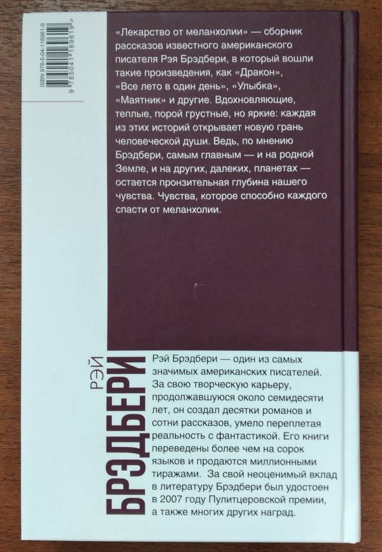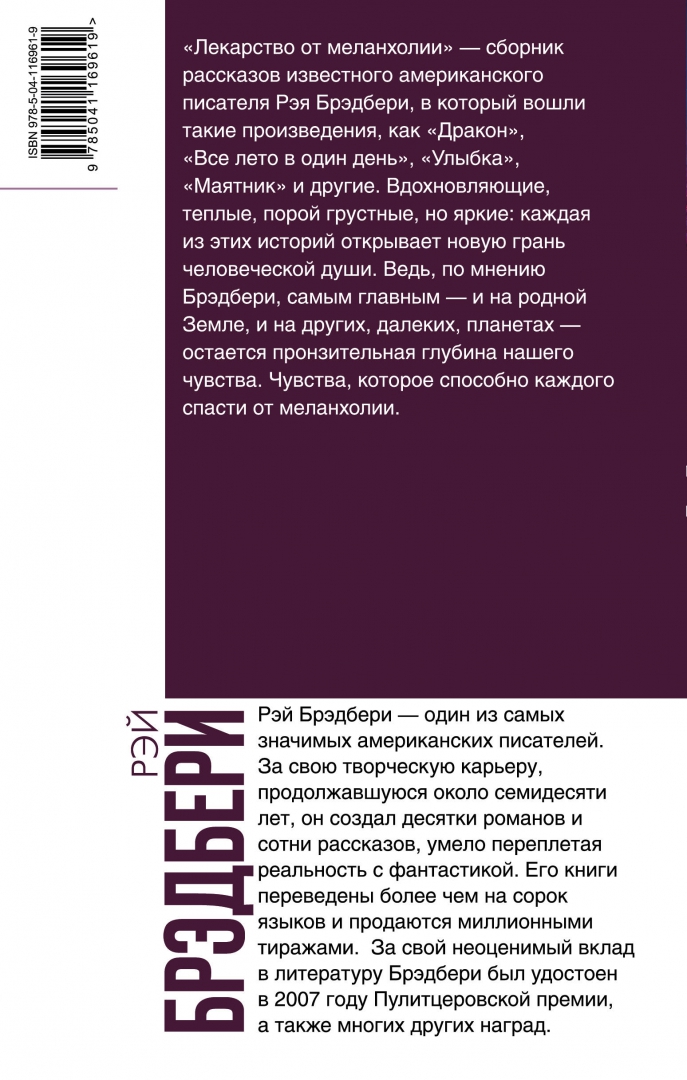 Описание"Лекарство от меланхолии" - сборник рассказов известного американского писателя Рэя Брэдбери, в который вошли такие произведения как "Дракон", "Все лето в один день", "Улыбка", "Маятник" и другие. Вдохновляющие, теплые, порой грустные, но яркие: каждая из этих историй открывает новую грань человеческой души. Ведь, по мнению Брэдбери, самым главным - и на родной Земле, и на других, далеких, планетах - остается пронзительная глубина нашего чувства. Чувства, которое способно каждого спасти от меланхолии."Лекарство от меланхолии" - сборник рассказов известного американского писателя Рэя Брэдбери, в который вошли такие произведения как "Дракон", "Все лето в один день", "Улыбка", "Маятник" и другие. Вдохновляющие, теплые, порой грустные, но яркие: каждая из этих историй открывает новую грань человеческой души. Ведь, по мнению Брэдбери, самым главным - и на родной Земле, и на других, далеких, планетах - остается пронзительная глубина нашего чувства. Чувства, которое способно каждого спасти от меланхолии.