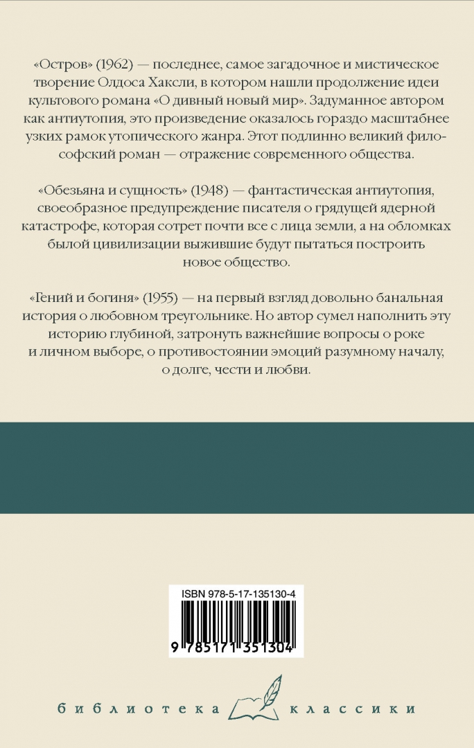 Описание«Остров» (1962) — последнее, самое загадочное и мистическое творение Олдоса Хаксли, в котором нашли продолжение идеи культового романа «О дивный новый мир». Задуманное автором как антиутопия, это произведение оказалось гораздо масштабнее узких рамок утопического жанра. Этот подлинно великий философский роман — отражение современного общества.«Обезьяна и сущность» (1948) — фантастическая антиутопия, своеобразное предупреждение писателя о грядущей ядерной катастрофе, которая сотрет почти все с лица земли, а на обломках былой цивилизации выжившие будут пытаться построить новое общество.«Гений и богиня» (1955) — на первый взгляд довольно банальная история о любовном треугольнике. Но автор сумел наполнить эту историю глубиной, затронуть важнейшие вопросы о роке и личном выборе, о противостоянии эмоций разумному началу, о долге, чести и любви.«Остров» (1962) — последнее, самое загадочное и мистическое творение Олдоса Хаксли, в котором нашли продолжение идеи культового романа «О дивный новый мир». Задуманное автором как антиутопия, это произведение оказалось гораздо масштабнее узких рамок утопического жанра. Этот подлинно великий философский роман — отражение современного общества.«Обезьяна и сущность» (1948) — фантастическая антиутопия, своеобразное предупреждение писателя о грядущей ядерной катастрофе, которая сотрет почти все с лица земли, а на обломках былой цивилизации выжившие будут пытаться построить новое общество.«Гений и богиня» (1955) — на первый взгляд довольно банальная история о любовном треугольнике. Но автор сумел наполнить эту историю глубиной, затронуть важнейшие вопросы о роке и личном выборе, о противостоянии эмоций разумному началу, о долге, чести и любви.