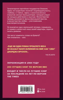 ОписаниеТоталитарное партийное государство Океания. Здесь не существует понятий "индивидуальность", "любовь" и "тайна". Здесь с многочисленных плакатов смотрит Большой Брат, который следит за каждым действием и мыслью. Министерство правды занимается фальсификацией фактов, а министерство любви – уничтожением мыслепреступников. Но внезапно один маленький человек, скрывшись от камер в крохотной нише своей квартиры, садится писать дневник. Что могут изменить слова на бумаге? Как оказалось – все.Тоталитарное партийное государство Океания. Здесь не существует понятий "индивидуальность", "любовь" и "тайна". Здесь с многочисленных плакатов смотрит Большой Брат, который следит за каждым действием и мыслью. Министерство правды занимается фальсификацией фактов, а министерство любви – уничтожением мыслепреступников. Но внезапно один маленький человек, скрывшись от камер в крохотной нише своей квартиры, садится писать дневник. Что могут изменить слова на бумаге? Как оказалось – все.