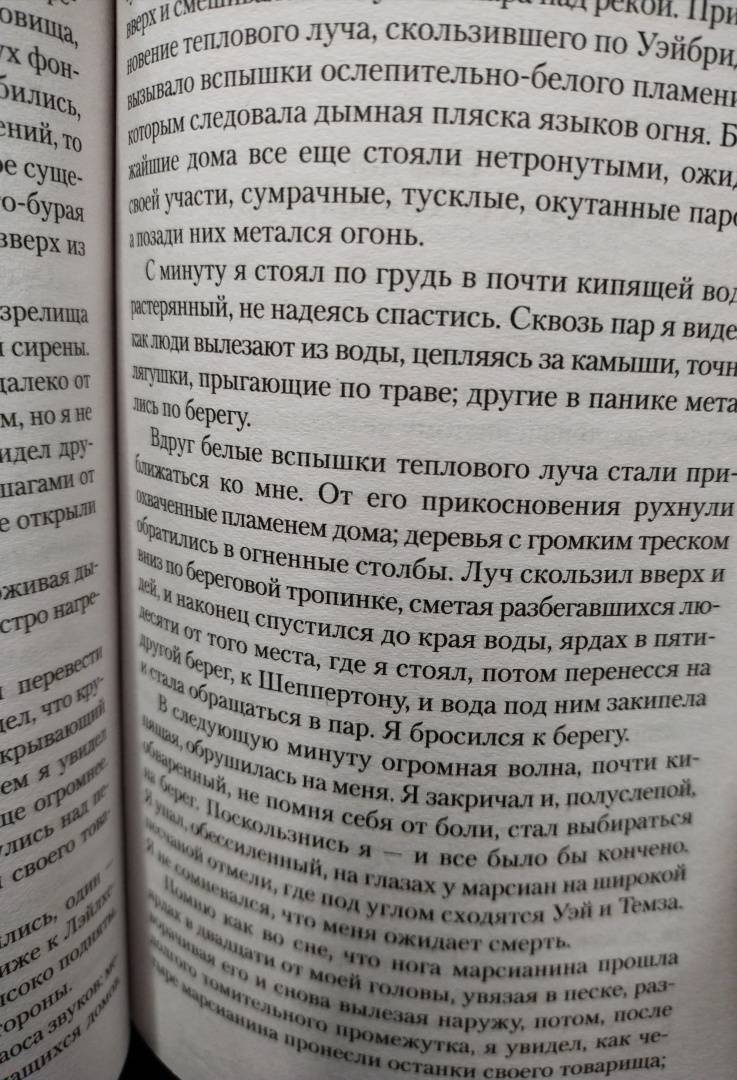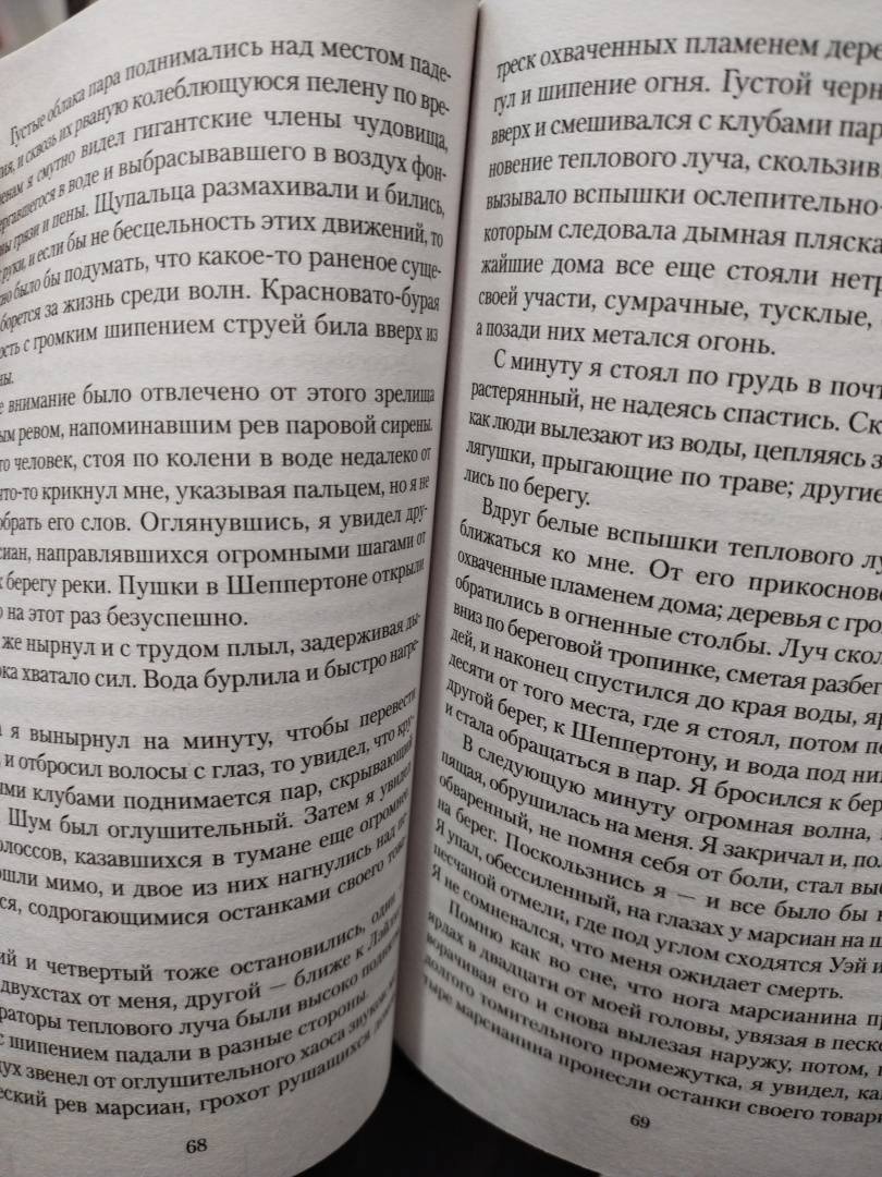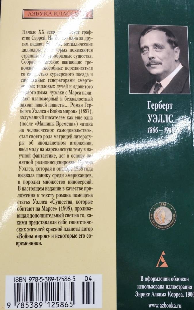 ОписаниеНачало ХХ века, английское графство Сэррей. На Землю один за другим падают большие металлические цилиндры, из которых появляются странные спрутообразные существа. Собрав гигантские шагающие треножники, способные передвигаться со скоростью курьерского поезда и снабженные генераторами смертоносных тепловых лучей и ядовитого черного дыма, чужаки с Марса начинают планомерный и безжалостный захват нашей планеты… Роман Герберта Уэллса «Война миров» (1897), задуманный писателем как еще одна (после «Машины времени») «атака на человеческое самодовольство», стал своего рода матрицей литературы об инопланетном вторжении, ввел моду на марсианскую тему в научной фантастике, лег в основу памятной радиоинсценировки Орсона Уэллса, которая в октябре 1938 года вызвала панику среди американцев, и породил множество киноверсий. В настоящем издании в качестве приложения к тексту романа помещена статья Уэллса «Существа, которые обитают на Марсе» (1908), проливающая дополнительный свет на то, какими представляли себе гипотетических жителей красной планеты автор и некоторые его современники.СвернутьНачало ХХ века, английское графство Сэррей. На Землю один за другим падают большие металлические цилиндры, из которых появляются странные спрутообразные существа. Собрав гигантские шагающие треножники, способные передвигаться со скоростью курьерского поезда и снабженные генераторами смертоносных тепловых лучей и ядовитого черного дыма, чужаки с Марса начинают планомерный и безжалостный захват нашей планеты… Роман Герберта Уэллса «Война миров» (1897), задуманный писателем как еще одна (после «Машины времени») «атака на человеческое самодовольство», стал своего рода матрицей литературы об инопланетном вторжении, ввел моду на марсианскую тему в научной фантастике, лег в основу памятной радиоинсценировки Орсона Уэллса, которая в октябре 1938 года вызвала панику среди американцев, и породил множество киноверсий. В настоящем издании в качестве приложения к тексту романа помещена статья Уэллса «Существа, которые обитают на Марсе» (1908), проливающая дополнительный свет на то, какими представляли себе гипотетических жителей красной планеты автор и некоторые его современники.СвернутьСвернуть