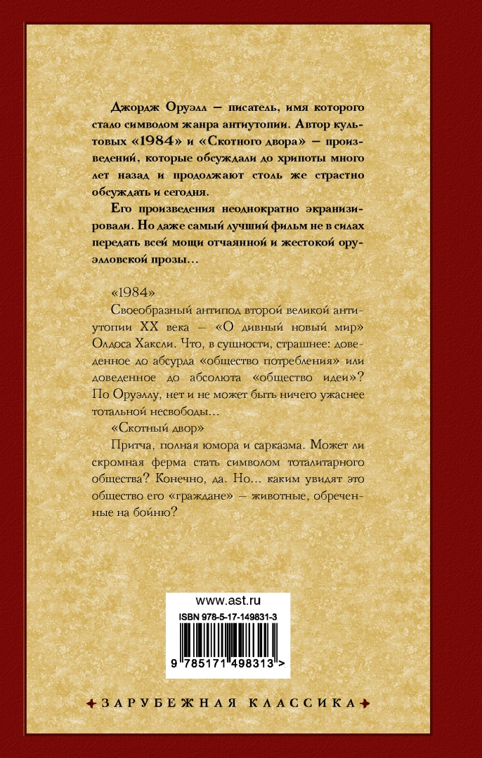 Описание"1984". Своеобразный антипод второй великой антиутопии XX века — "О дивный новый мир" Олдоса Хаксли. Что, в сущности, страшнее: доведенное до абсурда "общество потребления" — или доведенное до абсолюта "общество идеи"? По Оруэллу, нет и не может быть ничего ужаснее тотальной несвободы... "Скотный двор". Притча, полная юмора и сарказма. Может ли скромная ферма стать символом тоталитарного общества? Конечно, да. Но... каким увидят это общество его "граждане" — животные, обреченные на бойню?Каждый день Уинстон Смит переписывает историю в соответствии с новой линией Министерства Правды. С каждой ложью, которую он переносит на бумагу, Уинстон всё больше ненавидит Партию, которая не интересуется ничем кроме власти, и которая не терпит инакомыслия. Но чем больше Уинстон старается думать иначе, тем сложнее ему становится избежать ареста, ведь Большой Брат всегда следит за тобой…