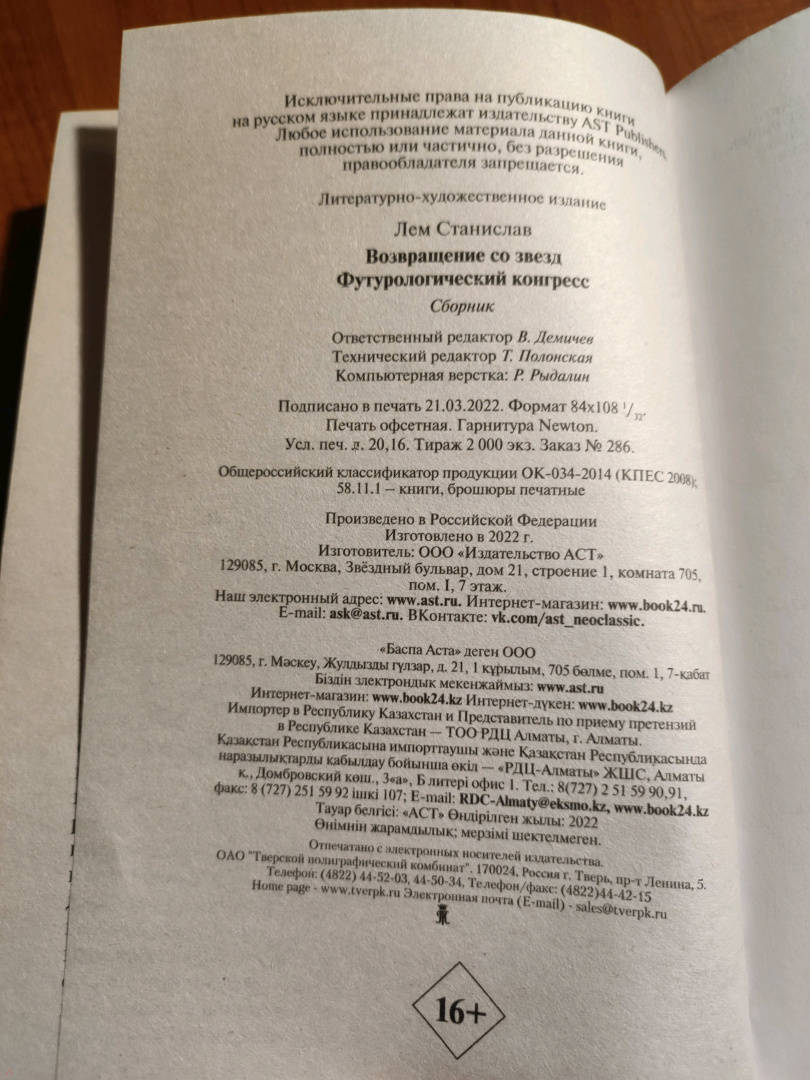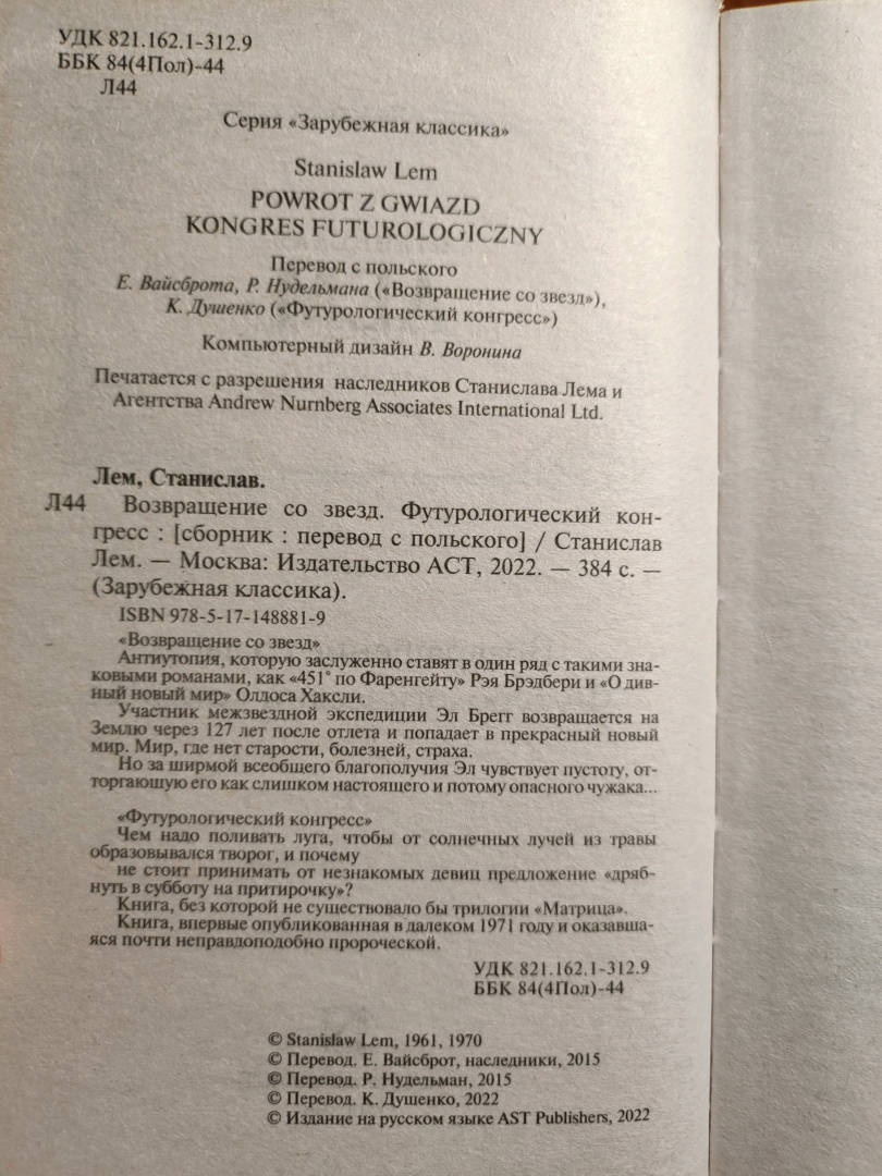 Описание"Возвращение со звезд"Антиутопия, которую заслуженно ставят в один ряд с такими знаковыми романами, как "451° по Фаренгейту" Рэя Брэдбери и "О дивный новый мир" Олдоса Хаксли.Участник межзвездной экспедиции Эл Брегг возвращается на Землю через 127 лет после отлета и попадает в прекрасный новый мир. Мир, где нет старости, болезней, страха.Но за ширмой всеобщего благополучия Эл чувствует пустоту, отторгающую его как слишком настоящего и потому опасного чужака…"Футурологический конгресс"Чем надо поливать луга, чтобы от солнечных лучей из травы образовывался творог, и почемуне стоит принимать от незнакомых девиц предложение "дрябнуть в субботу на притирочку"?Книга, без которой не существовало бы трилогии "Матрица".Книга, впервые опубликованная в далеком 1971 году и оказавшаяся почти неправдоподобно пророческой."Возвращение со звезд"Антиутопия, которую заслуженно ставят в один ряд с такими знаковыми романами, как "451° по Фаренгейту" Рэя Брэдбери и "О дивный новый мир" Олдоса Хаксли.Участник межзвездной экспедиции Эл Брегг возвращается на Землю через 127 лет после отлета и попадает в прекрасный новый мир. Мир, где нет старости, болезней, страха.Но за ширмой всеобщего благополучия Эл чувствует пустоту, отторгающую его как слишком настоящего и потому опасного чужака…"Футурологический конгресс"Чем надо поливать луга, чтобы от солнечных лучей из травы образовывался творог, и почемуне стоит принимать от незнакомых девиц предложение "дрябнуть в субботу на притирочку"?Книга, без которой не существовало бы трилогии "Матрица".Книга, впервые опубликованная в далеком 1971 году и оказавшаяся почти неправдоподобно пророческой.