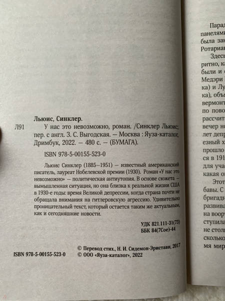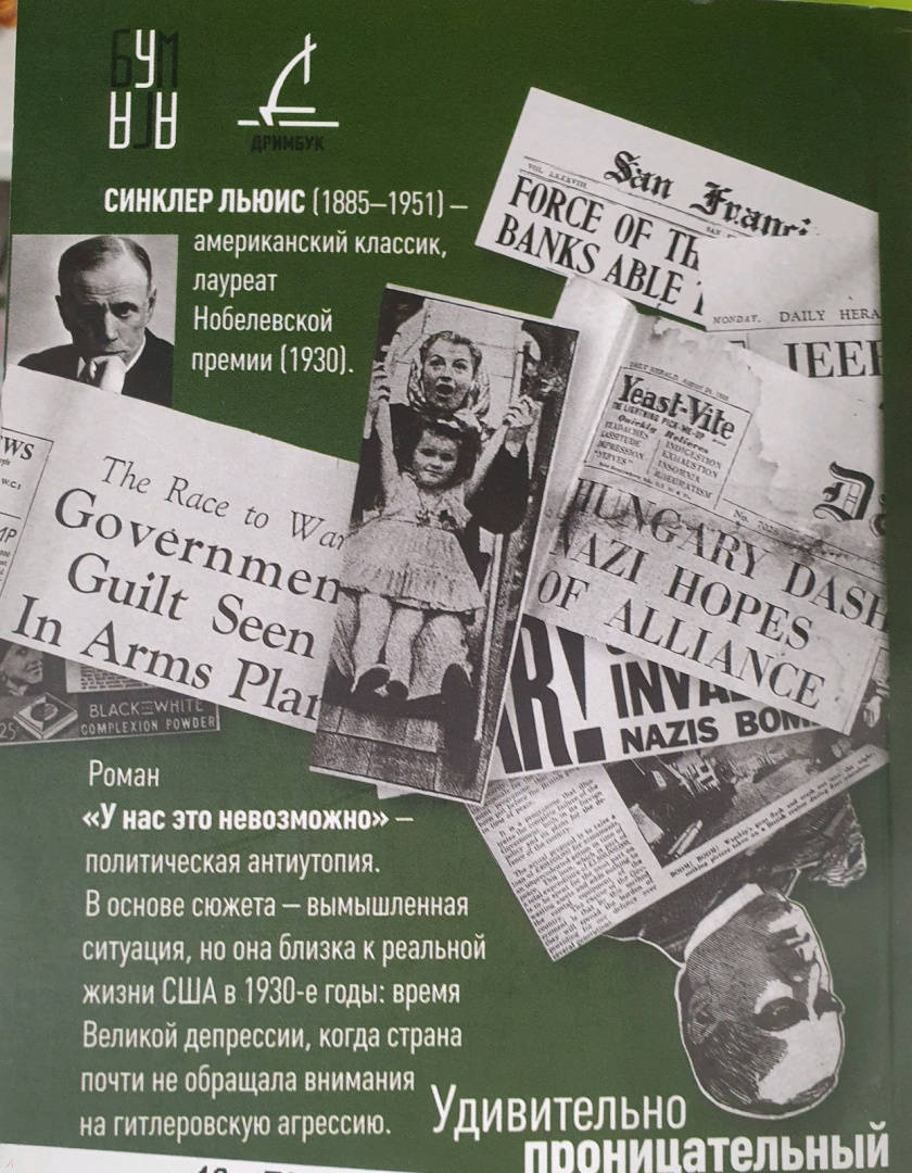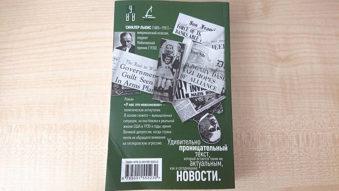 ОписаниеЛьюис Синклер (1885-1951) - известный американский писатель, лауреат Нобелевской премии (1930). Роман "У нас это невозможно" - политическая антиутопия. В основе сюжета - вымышленная ситуация, но она близка к реальной жизни США в 1930-е годы: время Великой депрессии, когда страна почти не обращала внимания на гитлеровскую агрессию. Удивительно проницательный текст, который остается таким же актуальным, как и сегодняшние новости.Льюис Синклер (1885-1951) - известный американский писатель, лауреат Нобелевской премии (1930). Роман "У нас это невозможно" - политическая антиутопия. В основе сюжета - вымышленная ситуация, но она близка к реальной жизни США в 1930-е годы: время Великой депрессии, когда страна почти не обращала внимания на гитлеровскую агрессию. Удивительно проницательный текст, который остается таким же актуальным, как и сегодняшние новости.