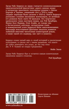 ОписаниеЭдгар Райс Берроуз по праву считается основоположником приключенческой фантастики: дорогу новому жанру в литературе проложили популярные романы о Джоне Картере и Тарзане, увидевшие свет в 1910-х годах (первые переводы были сделаны в 1920-х). Книги Берроуза разошлись сотнями миллионов экземпляров, по мотивам его романов было снято 60 фильмов. Его творчество вдохновляло таких мастеров жанра, как Рэй Брэдбери, Филип Хосе Фармер, Отис Клайн, не говоря уже о бесчисленных эпигонах; литературная слава и коммерческий успех Берроуза были ошеломляющими. Благодаря неистощимой фантазии писателя появился любимый многими читателями планетарный роман, а также такой его поджанр, как "меч и планета". Знаменитая марсианская трилогия Берроуза посвящена невероятным приключениям на Красной планете. Джон Картер, кавалерийский офицер из Виргинии, магическим образом переносится на Марс, где идет постоянная борьба между различными расами. Благодаря своему мужеству, решительности и находчивости Картер умудряется не только выжить, но и занять высокое положение в марсианском обществе, раздираемом интригами. Главной его наградой становится любовь прекрасной принцессы Гелиума, которую он освобождает из рабства. Подвиги в сражениях с воинственными племенами, воздушными пиратами и прочими силами марсианского зла сделали Джона Картера самым популярным долгожителем фантастической литературы.СвернутьЭдгар Райс Берроуз по праву считается основоположником приключенческой фантастики: дорогу новому жанру в литературе проложили популярные романы о Джоне Картере и Тарзане, увидевшие свет в 1910-х годах (первые переводы были сделаны в 1920-х). Книги Берроуза разошлись сотнями миллионов экземпляров, по мотивам его романов было снято 60 фильмов. Его творчество вдохновляло таких мастеров жанра, как Рэй Брэдбери, Филип Хосе Фармер, Отис Клайн, не говоря уже о бесчисленных эпигонах; литературная слава и коммерческий успех Берроуза были ошеломляющими. Благодаря неистощимой фантазии писателя появился любимый многими читателями планетарный роман, а также такой его поджанр, как "меч и планета". Знаменитая марсианская трилогия Берроуза посвящена невероятным приключениям на Красной планете. Джон Картер, кавалерийский офицер из Виргинии, магическим образом переносится на Марс, где идет постоянная борьба между различными расами. Благодаря своему мужеству, решительности и находчивости Картер умудряется не только выжить, но и занять высокое положение в марсианском обществе, раздираемом интригами. Главной его наградой становится любовь прекрасной принцессы Гелиума, которую он освобождает из рабства. Подвиги в сражениях с воинственными племенами, воздушными пиратами и прочими силами марсианского зла сделали Джона Картера самым популярным долгожителем фантастической литературы.СвернутьСвернуть