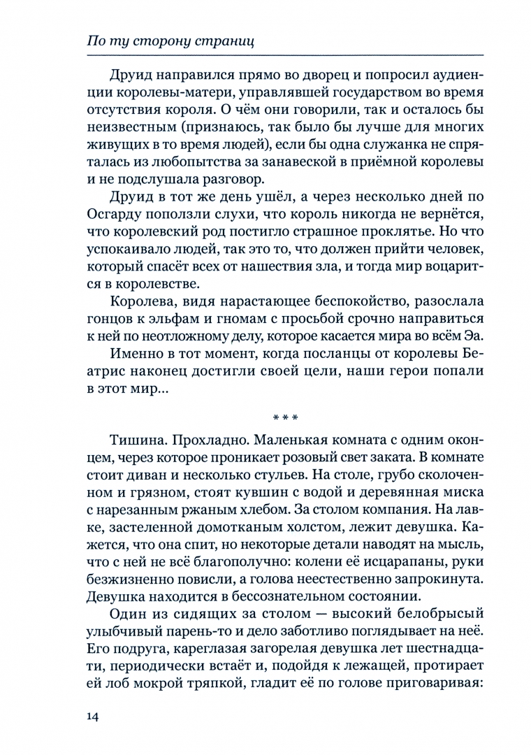 ОписаниеПриключенческий роман "По ту сторону страниц" наверняка понравится любителям Толкиена, Клайва Стейплза Льюиса и других авторов, писавших в том же стиле. Вы узнаете о пятерых друзьях, которых неведомая сила занесла в мир волшебства, населённый удивительными созданиями - эльфами, гномами, орками и обычными людьми. Ну… лишь отчасти обычными. Друзей разметало по всему этому удивительному миру, и теперь им предстоит найти друг друга, пройдя испытания и познакомившись с местными жителями.И вполне возможно, им придётся узнать и о себе нечто, неизвестное доселе. Например, о своих совершенно необычных для планеты Земля способностях. А потом и вовсе окажется, что от решений и поступков наших героев будет зависеть судьба целого мира…Но всему своё время. А пока что вы пронесётесь по воздуху на драконе и изучите древние леса, скрывающие много тайн. Пройдётесь по горным ущельям, отбиваясь от отрядов гоблинов, и поучаствуете в других приключениях.В добрый путь, читатель!Приключенческий роман "По ту сторону страниц" наверняка понравится любителям Толкиена, Клайва Стейплза Льюиса и других авторов, писавших в том же стиле. Вы узнаете о пятерых друзьях, которых неведомая сила занесла в мир волшебства, населённый удивительными созданиями - эльфами, гномами, орками и обычными людьми. Ну… лишь отчасти обычными. Друзей разметало по всему этому удивительному миру, и теперь им предстоит найти друг друга, пройдя испытания и познакомившись с местными жителями.И вполне возможно, им придётся узнать и о себе нечто, неизвестное доселе. Например, о своих совершенно необычных для планеты Земля способностях. А потом и вовсе окажется, что от решений и поступков наших героев будет зависеть судьба целого мира…Но всему своё время. А пока что вы пронесётесь по воздуху на драконе и изучите древние леса, скрывающие много тайн. Пройдётесь по горным ущельям, отбиваясь от отрядов гоблинов, и поучаствуете в других приключениях.В добрый путь, читатель!