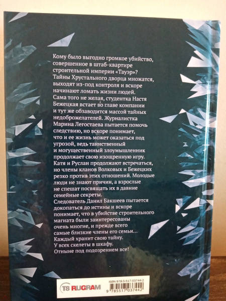 ОписаниеКому было выгодно громкое убийство, совершенное в штаб-квартире строительной империи «Тауэр»? Тайны Хрустального дворца множатся, выходят из-под контроля и вскоре начинают ломать жизни людей.Сама того не желая, студентка Настя Бежецкая встает во главе компании и тут же обзаводится массой тайных недоброжелателей. Журналистка Марина Легостаева пытается помочь следствию, но вскоре понимает, что и ее жизнь может оказаться под угрозой, ведь таинственный и могущественный злоумышленник продолжает свою изощренную игру.Катя и Руслан продолжают встречаться, но члены кланов Волковых и Бежецких резко против этих отношений. Молодые люди не знают причин, а взрослые не спешат посвящать их в давние семейные секреты.Следователь Данил Бакшеев пытается докопаться до истины и вскоре понимает, что в убийстве строительного магната были заинтересованы очень многие, и прежде всего самые близкие члены его семьи...Каждый хранит свою тайну. У всех скелеты в шкафу.Отныне под подозрением все!СвернутьКому было выгодно громкое убийство, совершенное в штаб-квартире строительной империи «Тауэр»? Тайны Хрустального дворца множатся, выходят из-под контроля и вскоре начинают ломать жизни людей.Сама того не желая, студентка Настя Бежецкая встает во главе компании и тут же обзаводится массой тайных недоброжелателей. Журналистка Марина Легостаева пытается помочь следствию, но вскоре понимает, что и ее жизнь может оказаться под угрозой, ведь таинственный и могущественный злоумышленник продолжает свою изощренную игру.Катя и Руслан продолжают встречаться, но члены кланов Волковых и Бежецких резко против этих отношений. Молодые люди не знают причин, а взрослые не спешат посвящать их в давние семейные секреты.Следователь Данил Бакшеев пытается докопаться до истины и вскоре понимает, что в убийстве строительного магната были заинтересованы очень многие, и прежде всего самые близкие члены его семьи...Каждый хранит свою тайну. У всех скелеты в шкафу.Отныне под подозрением все!СвернутьСвернуть