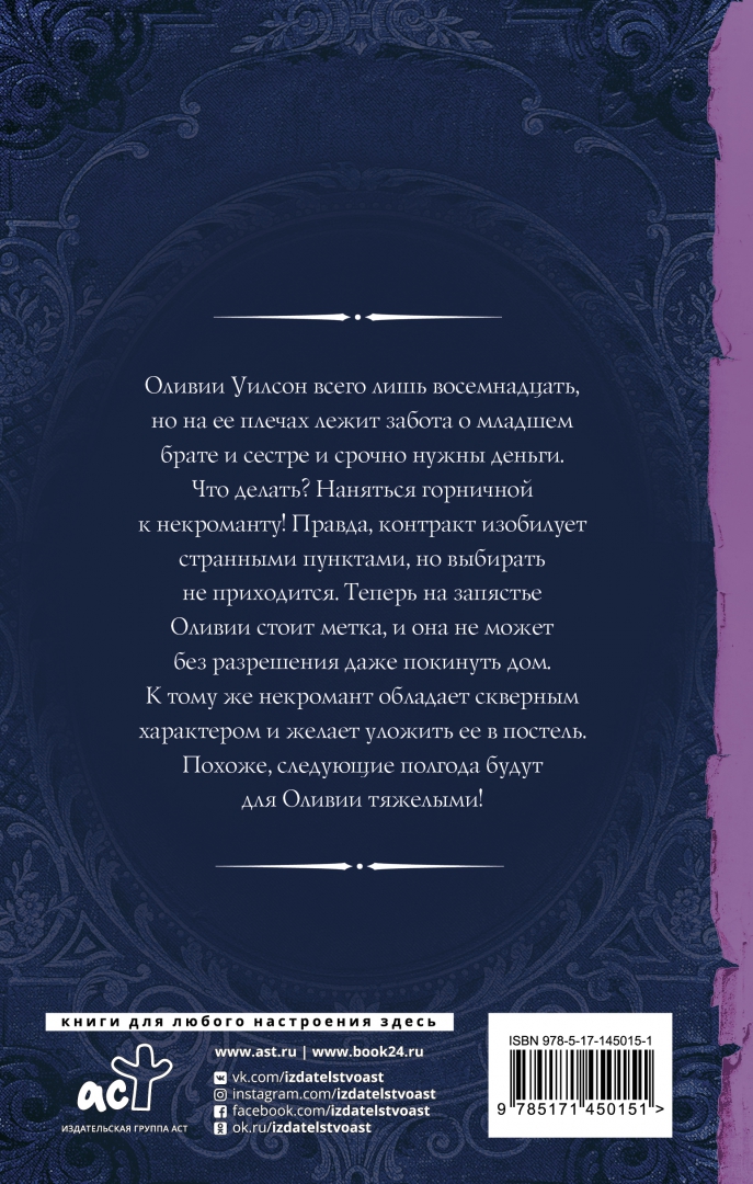 ОписаниеОливии Уилсон всего лишь восемнадцать, но на ее плечах лежит забота о младшем брате и сестре и срочно нужны деньги. Что делать? Наняться горничной к некроманту! Правда, контракт изобилует странными пунктами, но выбирать не приходится. Теперь на запястье Оливии стоит метка, и она не может без разрешения даже покинуть дом. К тому же некромант обладает скверным характером и желает уложить ее в постель. Похоже, следующие полгода будут для Оливии тяжелыми!Оливии Уилсон всего лишь восемнадцать, но на ее плечах лежит забота о младшем брате и сестре и срочно нужны деньги. Что делать? Наняться горничной к некроманту! Правда, контракт изобилует странными пунктами, но выбирать не приходится. Теперь на запястье Оливии стоит метка, и она не может без разрешения даже покинуть дом. К тому же некромант обладает скверным характером и желает уложить ее в постель. Похоже, следующие полгода будут для Оливии тяжелыми!