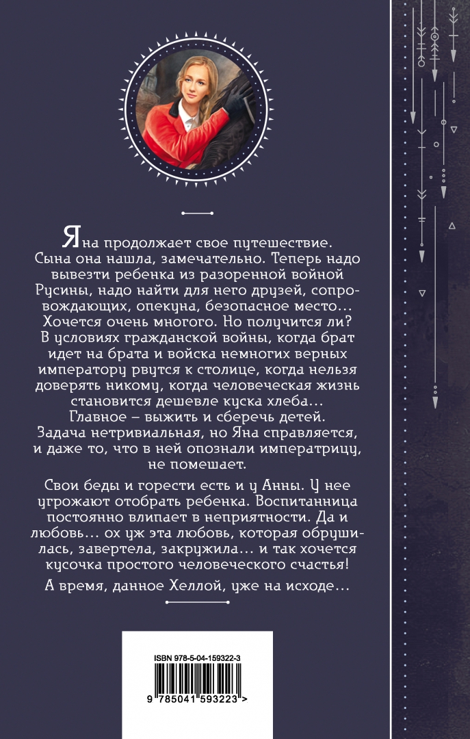 ОписаниеЯна продолжает свое путешествие. Сына она нашла, замечательно. Теперь надо вывезти ребенка из разоренной войной Русины, надо найти для него друзей, сопровождающих, опекуна, безопасное место… хочется очень многого. Но получится ли? В условиях гражданской войны, когда брат идет на брата и войска немногих верных императору рвутся к столице, когда нельзя доверять никому, когда человеческая жизнь становится дешевле куска хлеба… Главное — выжить и сберечь детей. Задача нетривиальная, но Яна справляется, и даже то, что в ней опознали императрицу, не помешает. Свои беды и горести есть и у Анны. У нее угрожают отобрать ребенка. Воспитанница постоянно влипает в неприятности. Да и любовь… ох уж эта любовь, которая обрушилась, завертела, закружила… и так хочется кусочка простого человеческого счастья! А время, данное Хеллой, уже на исходе…Яна продолжает свое путешествие. Сына она нашла, замечательно. Теперь надо вывезти ребенка из разоренной войной Русины, надо найти для него друзей, сопровождающих, опекуна, безопасное место… хочется очень многого. Но получится ли? В условиях гражданской войны, когда брат идет на брата и войска немногих верных императору рвутся к столице, когда нельзя доверять никому, когда человеческая жизнь становится дешевле куска хлеба… Главное — выжить и сберечь детей. Задача нетривиальная, но Яна справляется, и даже то, что в ней опознали императрицу, не помешает. Свои беды и горести есть и у Анны. У нее угрожают отобрать ребенка. Воспитанница постоянно влипает в неприятности. Да и любовь… ох уж эта любовь, которая обрушилась, завертела, закружила… и так хочется кусочка простого человеческого счастья! А время, данное Хеллой, уже на исходе…