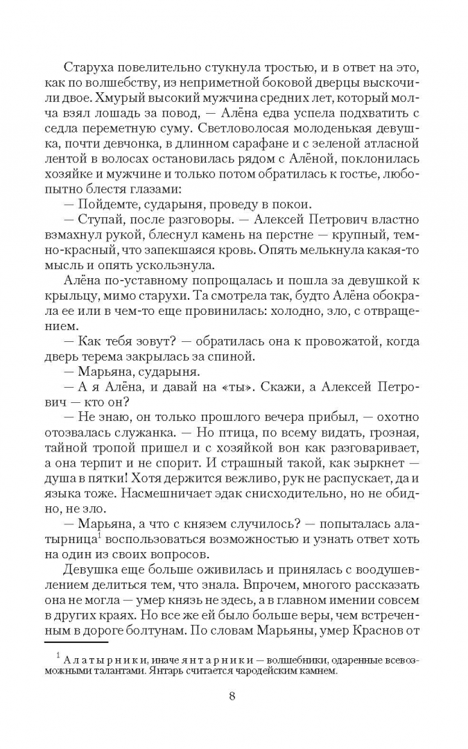 ОписаниеСлужба на границе с Великой топью - не мед, но Алёне Емановой там нравилось. А когда воля главы Разбойного приказа вынудила ее прибыть в княжеский дворец, о прежней опасной, но простой жизни осталось только мечтать. Вот уж где настоящее болото! И то, что на Алёну, как на живца, намерены ловить преступника,- меньшая из бед. Куда хуже интерес княжеского наследника, враждебность девиц из свиты княгини и колючий взгляд первого княжеского воеводы Олега Рубцова, прозванного Янтарноглазым.С воеводой, пожалуй, тяжелее всего. К опасности Алёне не привыкать, а вот с собственным сердцем попробуй сладить!Служба на границе с Великой топью - не мед, но Алёне Емановой там нравилось. А когда воля главы Разбойного приказа вынудила ее прибыть в княжеский дворец, о прежней опасной, но простой жизни осталось только мечтать. Вот уж где настоящее болото! И то, что на Алёну, как на живца, намерены ловить преступника,- меньшая из бед. Куда хуже интерес княжеского наследника, враждебность девиц из свиты княгини и колючий взгляд первого княжеского воеводы Олега Рубцова, прозванного Янтарноглазым.С воеводой, пожалуй, тяжелее всего. К опасности Алёне не привыкать, а вот с собственным сердцем попробуй сладить!