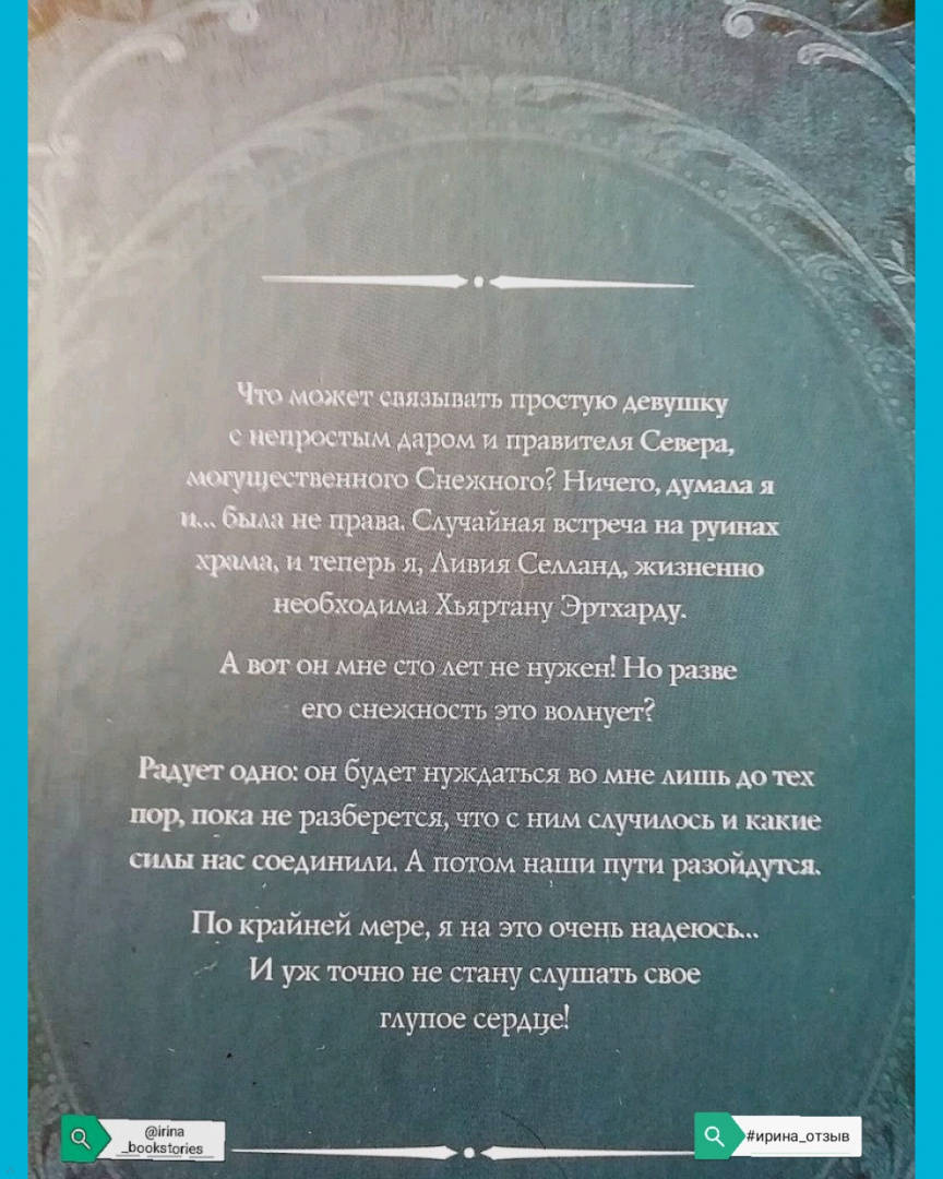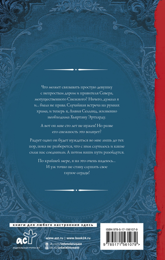 ОписаниеЧто может связывать простую девушку с непростым даром и правителя Севера, могущественного Снежного? Ничего, думала я и… была не права. Случайная встреча на руинах храма, и теперь я, Ливия Селланд, жизненно необходима Хьяртану Эртхарду. А вот он мне сто лет не нужен! Но разве его снежность это волнует?Радует одно: он будет нуждаться во мне лишь до тех пор, пока не разберется, что с ним случилось и какие силы нас соединили. А потом наши пути разойдутся. По крайней мере, я на это очень надеюсь.… И уж точно не стану слушать свое глупое сердце!Что может связывать простую девушку с непростым даром и правителя Севера, могущественного Снежного? Ничего, думала я и… была не права. Случайная встреча на руинах храма, и теперь я, Ливия Селланд, жизненно необходима Хьяртану Эртхарду. А вот он мне сто лет не нужен! Но разве его снежность это волнует?Радует одно: он будет нуждаться во мне лишь до тех пор, пока не разберется, что с ним случилось и какие силы нас соединили. А потом наши пути разойдутся. По крайней мере, я на это очень надеюсь.… И уж точно не стану слушать свое глупое сердце!