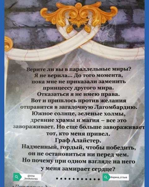 ОписаниеВерите ли вы в параллельные миры? Я не верила...До того момента, пока мне не приказали заменить принцессу другого мира. Отказаться я не имею права.Вот и пришлось против желания отправится в загадочную Лагомбардию.Южное солнце, зеленые холмы, древние храмы и магия - все это завораживает. Но еще больше завораживает тот, кто меня привел. Граф Алай-стер. Надменный, гордый, чтобы победить, он не остановиться ни перед чем. Но почему при одном взгляде на него у меня замирает сердце?Верите ли вы в параллельные миры? Я не верила...До того момента, пока мне не приказали заменить принцессу другого мира. Отказаться я не имею права.Вот и пришлось против желания отправится в загадочную Лагомбардию.Южное солнце, зеленые холмы, древние храмы и магия - все это завораживает. Но еще больше завораживает тот, кто меня привел. Граф Алай-стер. Надменный, гордый, чтобы победить, он не остановиться ни перед чем. Но почему при одном взгляде на него у меня замирает сердце?