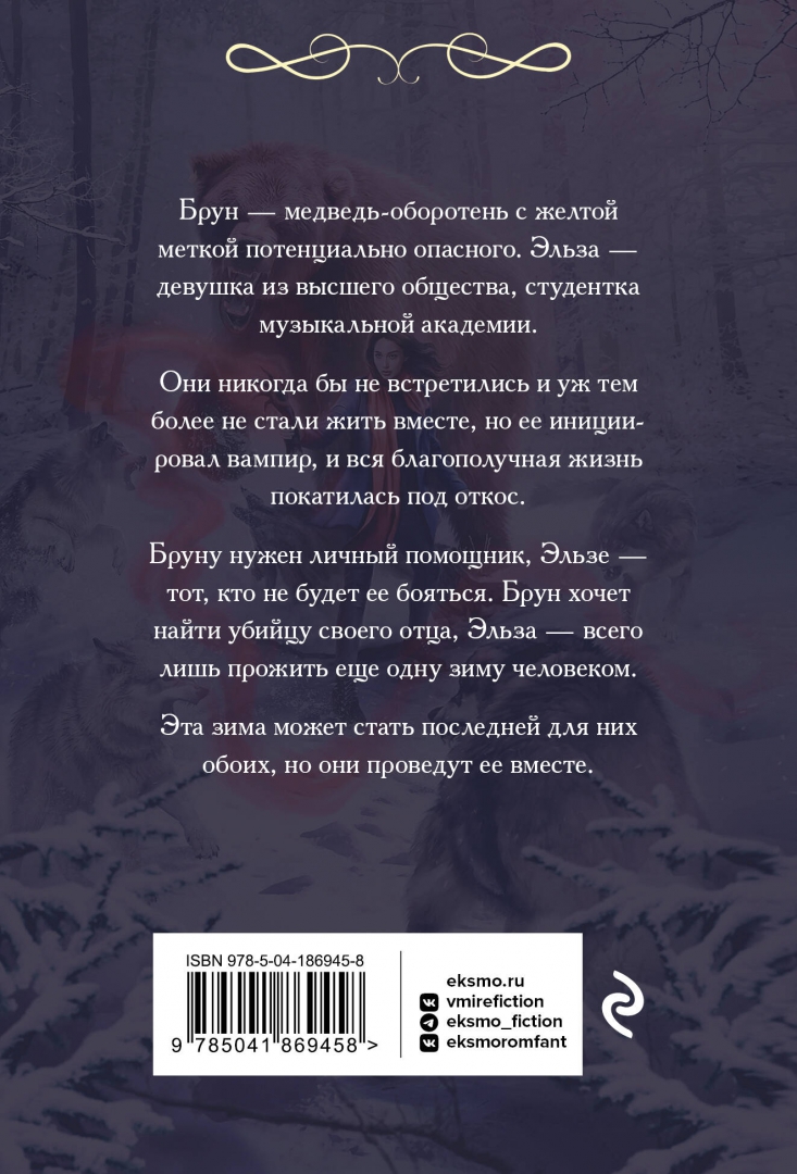 ОписаниеБрун — медведь-оборотень с желтой меткой потенциально опасного. Эльза — девушка из высшего общества, студентка музыкальной академии. Они никогда бы не встретились и уж тем более не стали жить вместе, но встречу инициировал вампир, и вся благополучная жизнь покатилась под откос. Бруну нужен личный помощник, Эльзе — тот, кто не будет ее бояться. Брун хочет найти убийцу своего отца, Эльза — всего лишь прожить еще одну зиму человеком. Эта зима может стать последней для них обоих, но они проведут ее вместе.Брун — медведь-оборотень с желтой меткой потенциально опасного. Эльза — девушка из высшего общества, студентка музыкальной академии. Они никогда бы не встретились и уж тем более не стали жить вместе, но встречу инициировал вампир, и вся благополучная жизнь покатилась под откос. Бруну нужен личный помощник, Эльзе — тот, кто не будет ее бояться. Брун хочет найти убийцу своего отца, Эльза — всего лишь прожить еще одну зиму человеком. Эта зима может стать последней для них обоих, но они проведут ее вместе.