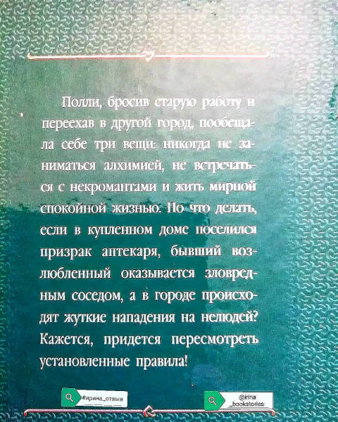 ОписаниеПолли, бросив старую работу и переехав в другой город, пообещала себе три вещи: никогда не заниматься алхимией, не встречаться с некромантами и жить мирной спокойной жизнью. Но что делать, если в купленном доме поселился призрак аптекаря, бывший возлюбленный оказывается зловредным соседом, а в городе происходят жуткие нападения на нелюдей? Кажется, придется пересмотреть установленные правила!Полли, бросив старую работу и переехав в другой город, пообещала себе три вещи: никогда не заниматься алхимией, не встречаться с некромантами и жить мирной спокойной жизнью. Но что делать, если в купленном доме поселился призрак аптекаря, бывший возлюбленный оказывается зловредным соседом, а в городе происходят жуткие нападения на нелюдей? Кажется, придется пересмотреть установленные правила!