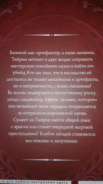 ОписаниеБывший маг-артефактор, а ныне механик, Тайрин мечтает о двух вещах: сохранить мастерскую покойного мужа и найти его убийц. Кто же знал, что в наследство ей достались не только механизмы и артефакты, но и неприятности, с ними связанные!Ее жизнь подвергается нешуточному риску, когда следователь Лэртис, человек, которого она ненавидит всем сердцем, отправляется за отпрыском королевской крови.Сумеет ли Тайрин найти общий язык с врагом или станет очередной жертвой преступления? Клубок загадок становится все опаснее и запутаннее.Бывший маг-артефактор, а ныне механик, Тайрин мечтает о двух вещах: сохранить мастерскую покойного мужа и найти его убийц. Кто же знал, что в наследство ей достались не только механизмы и артефакты, но и неприятности, с ними связанные!Ее жизнь подвергается нешуточному риску, когда следователь Лэртис, человек, которого она ненавидит всем сердцем, отправляется за отпрыском королевской крови.Сумеет ли Тайрин найти общий язык с врагом или станет очередной жертвой преступления? Клубок загадок становится все опаснее и запутаннее.