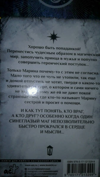 ОписаниеХорошо быть попаданкой! Перенестись чудесным образом в магический мир, заполучить принца в мужья и попутно совершить героический поступок...Только Марина почему-то с этим не согласна. Мало того что ее чуть не утопили, так еще и домой отпустить не хотят, твердя о каком-то удивительном даре, о котором и сами ничего не знают. К тому же ей не дают покоя странные сны, где кто-то называет Марину сестрой и просит о помощи. И как тут понять, кто враг, а кто друг? Особенно когда один синеглазый маг непозволительно быстро прокрался в сердце и мысли…Хорошо быть попаданкой! Перенестись чудесным образом в магический мир, заполучить принца в мужья и попутно совершить героический поступок...Только Марина почему-то с этим не согласна. Мало того что ее чуть не утопили, так еще и домой отпустить не хотят, твердя о каком-то удивительном даре, о котором и сами ничего не знают. К тому же ей не дают покоя странные сны, где кто-то называет Марину сестрой и просит о помощи. И как тут понять, кто враг, а кто друг? Особенно когда один синеглазый маг непозволительно быстро прокрался в сердце и мысли…