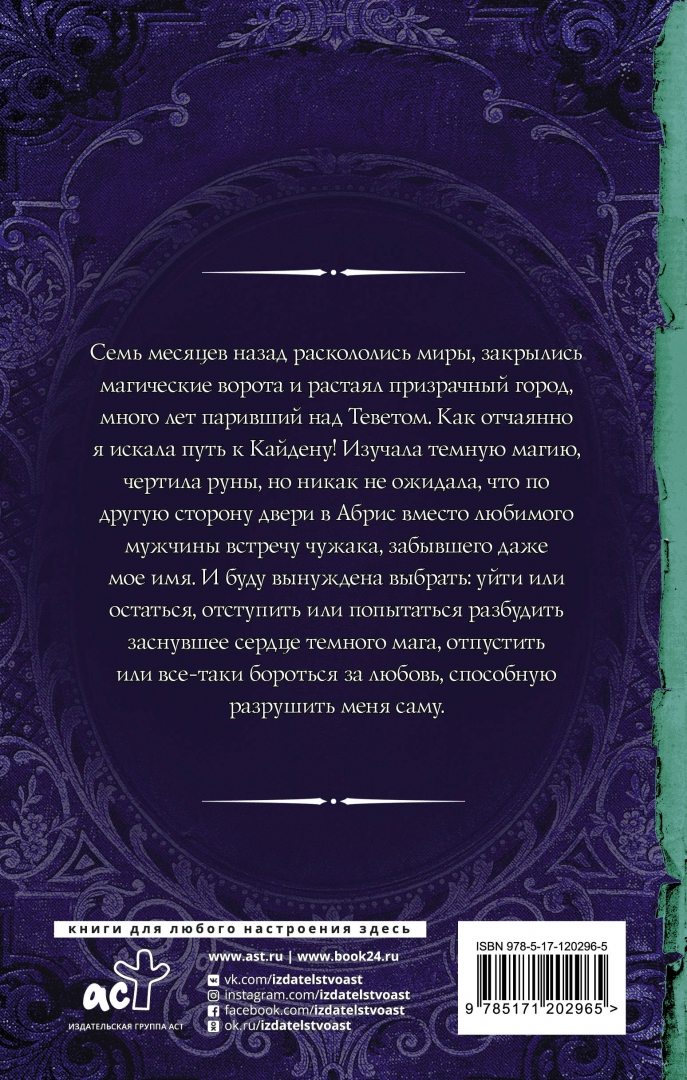 ОписаниеСемь месяцев назад раскололись миры, закрылись магические ворота и растаял призрачный город, много лет паривший над Теветом. Как отчаянно я искала путь к Кайдену! Изучала темную магию, чертила руны, но никак не ожидала, что по другую сторону двери в Абрис вместо любимого мужчины встречу чужака, забывшего даже мое имя. И буду вынуждена выбрать: уйти или остаться, отступить или попытаться разбудить заснувшее сердце темного мага, отпустить или все-таки бороться за любовь, способную разрушить меня саму.Семь месяцев назад раскололись миры, закрылись магические ворота и растаял призрачный город, много лет паривший над Теветом. Как отчаянно я искала путь к Кайдену! Изучала темную магию, чертила руны, но никак не ожидала, что по другую сторону двери в Абрис вместо любимого мужчины встречу чужака, забывшего даже мое имя. И буду вынуждена выбрать: уйти или остаться, отступить или попытаться разбудить заснувшее сердце темного мага, отпустить или все-таки бороться за любовь, способную разрушить меня саму.