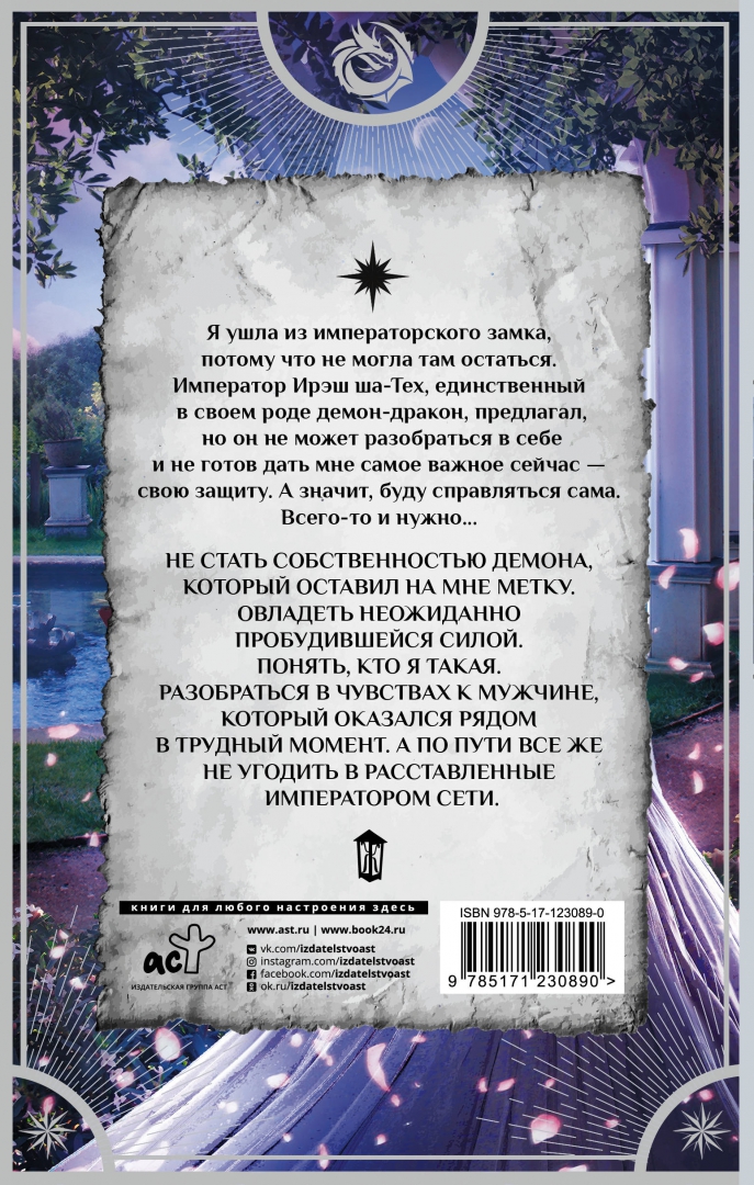 ОписаниеЯ ушла из императорского замка, потому что не могла поступить иначе. Император Ирэш ша-Тех, единственный в своем роде демон-дракон, предлагал остаться, но он не может разобраться в себе и не готов дать мне самое важное сейчас - свою защиту. А значит, буду справляться сама. Всего-то и нужно... Не стать собственностью демона, который оставил на мне метку. Овладеть неожиданно пробудившейся силой. Понять, кто я такая. Разобраться в чувствах к мужчине, который оказался рядом в трудный момент. А по пути все же не угодить в расставленные императором сети.Я ушла из императорского замка, потому что не могла поступить иначе. Император Ирэш ша-Тех, единственный в своем роде демон-дракон, предлагал остаться, но он не может разобраться в себе и не готов дать мне самое важное сейчас - свою защиту. А значит, буду справляться сама. Всего-то и нужно... Не стать собственностью демона, который оставил на мне метку. Овладеть неожиданно пробудившейся силой. Понять, кто я такая. Разобраться в чувствах к мужчине, который оказался рядом в трудный момент. А по пути все же не угодить в расставленные императором сети.