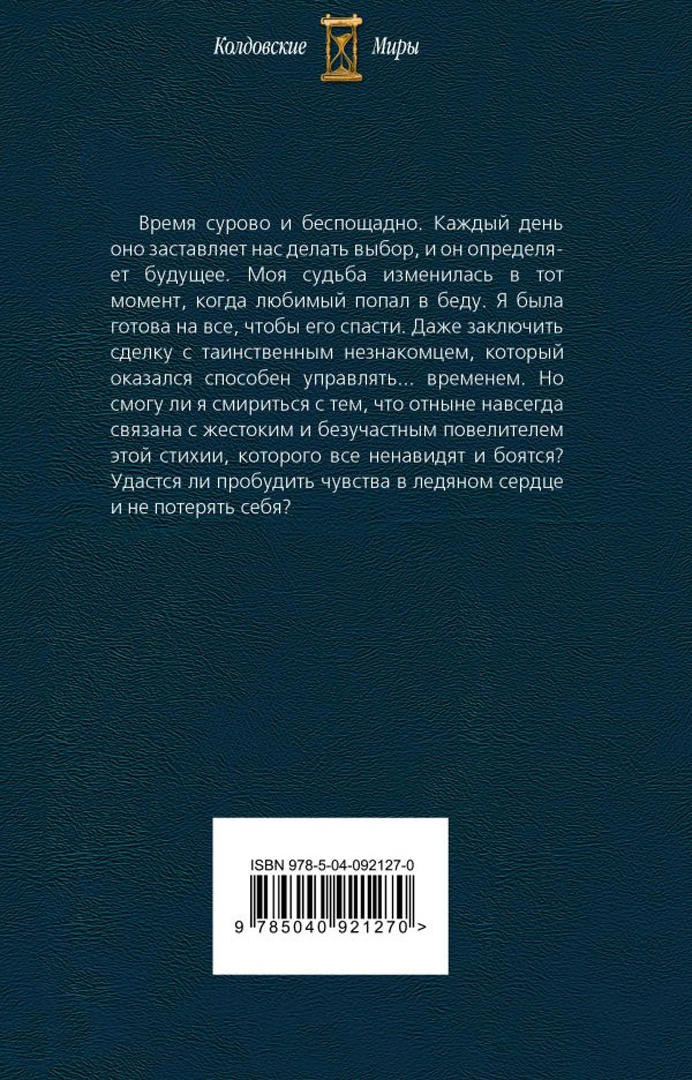 ОписаниеВремя сурово и беспощадно. Каждый день оно заставляет нас делать выбор, и он определяет будущее. Моя судьба изменилась в тот момент, когда любимый попал в беду. Я была готова на все, чтобы его спасти. Даже заключить сделку с таинственным незнакомцем, который оказался способен управлять… временем. Но смогу ли я смириться с тем, что отныне навсегда связана с жестоким и безучастным повелителем этой стихии, которого все ненавидят и боятся? Удастся ли пробудить чувства в ледяном сердце и не потерять себя?Время сурово и беспощадно. Каждый день оно заставляет нас делать выбор, и он определяет будущее. Моя судьба изменилась в тот момент, когда любимый попал в беду. Я была готова на все, чтобы его спасти. Даже заключить сделку с таинственным незнакомцем, который оказался способен управлять… временем. Но смогу ли я смириться с тем, что отныне навсегда связана с жестоким и безучастным повелителем этой стихии, которого все ненавидят и боятся? Удастся ли пробудить чувства в ледяном сердце и не потерять себя?