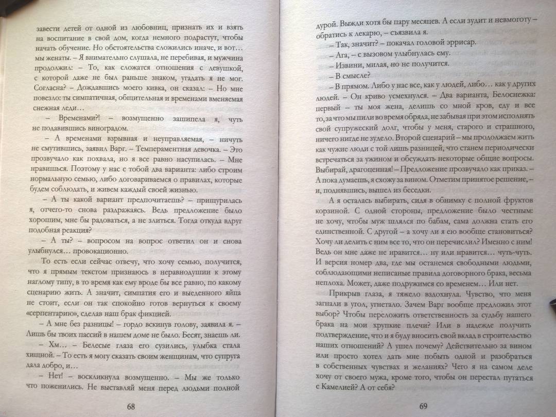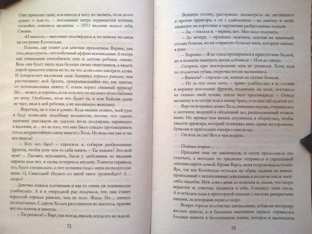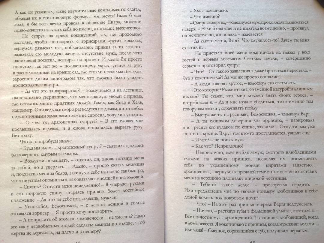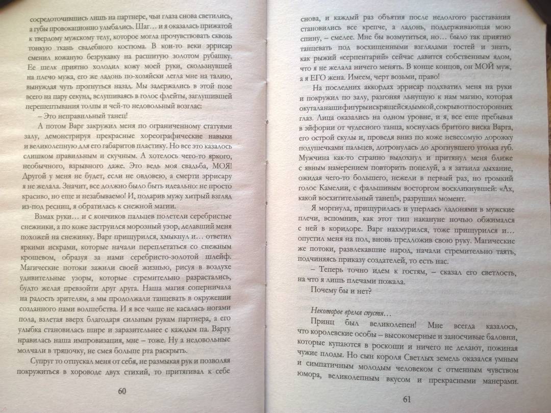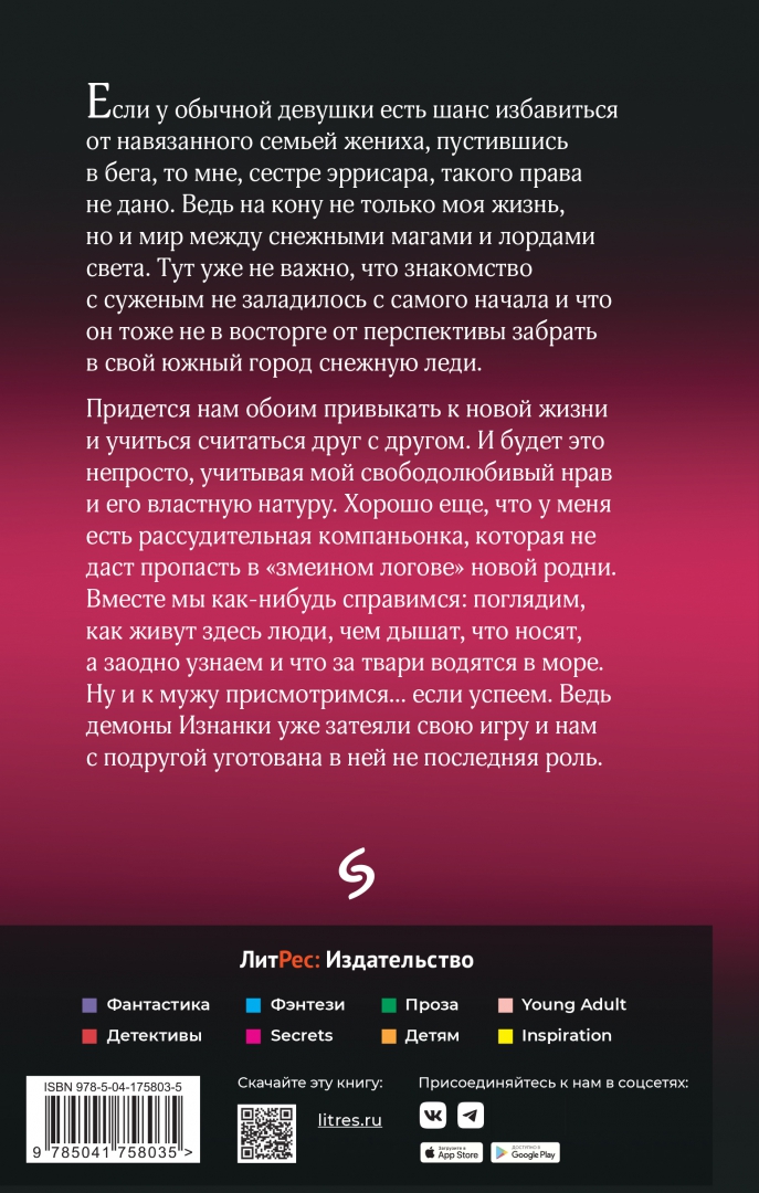 ОписаниеЕсли у обычной девушки есть шанс избавиться от навязанного семьей жениха, пустившись в бега, то мне, сестре эррисара, такого права не дано. Ведь на кону не только моя жизнь, но и мир между снежными магами и лордами света. Тут уже не важно, что знакомство с суженым не заладилось с самого начала и что он тоже не в восторге от перспективы забрать в свой южный город снежную леди.Придется нам обоим привыкать к новой жизни и учиться считаться друг с другом. И будет это не просто, учитывая мой свободолюбивый нрав и его властную натуру. Хорошо еще, что у меня есть рассудительная компаньонка, которая не даст пропасть в "змеином логове" новой родни. Вместе мы как-нибудь справимся: поглядим, как живут здесь люди, чем дышат, что носят, а заодно узнаем и что за твари водятся в море. Ну и к мужу присмотримся... если успеем. Ведь демоны Изнанки уже затеяли свою игру, и нам с подругой уготована в ней не последняя роль.Если у обычной девушки есть шанс избавиться от навязанного семьей жениха, пустившись в бега, то мне, сестре эррисара, такого права не дано. Ведь на кону не только моя жизнь, но и мир между снежными магами и лордами света. Тут уже не важно, что знакомство с суженым не заладилось с самого начала и что он тоже не в восторге от перспективы забрать в свой южный город снежную леди.Придется нам обоим привыкать к новой жизни и учиться считаться друг с другом. И будет это не просто, учитывая мой свободолюбивый нрав и его властную натуру. Хорошо еще, что у меня есть рассудительная компаньонка, которая не даст пропасть в "змеином логове" новой родни. Вместе мы как-нибудь справимся: поглядим, как живут здесь люди, чем дышат, что носят, а заодно узнаем и что за твари водятся в море. Ну и к мужу присмотримся... если успеем. Ведь демоны Изнанки уже затеяли свою игру, и нам с подругой уготована в ней не последняя роль.
