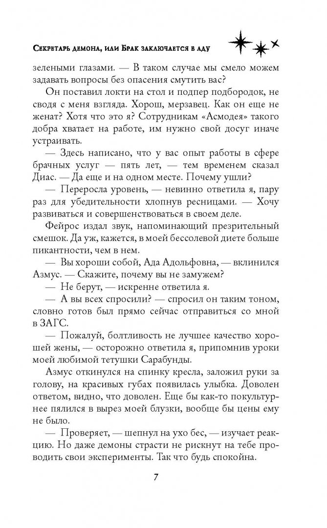 ОписаниеБрак заключается на небесах? Как бы не так! Иначе почему столько потом проблем в семейной жизни?Ответ на этот вопрос и многие другие я узнала, когда попала секретарём в брачное агентство "Асмодей" и получила сразу трёх начальников. Страсти кипят, работа не стоит на месте, всем обратившимся нужно отыскать пару. А мне регулярно шлет подарки таинственный незнакомец, и надо с этим срочно разобраться!Брак заключается на небесах? Как бы не так! Иначе почему столько потом проблем в семейной жизни?Ответ на этот вопрос и многие другие я узнала, когда попала секретарём в брачное агентство "Асмодей" и получила сразу трёх начальников. Страсти кипят, работа не стоит на месте, всем обратившимся нужно отыскать пару. А мне регулярно шлет подарки таинственный незнакомец, и надо с этим срочно разобраться!