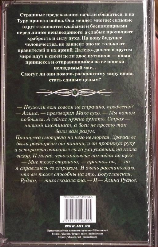ОписаниеСтрашные предсказания начали сбываться, и на Туру пришла война. Она меняет многое: сильные вдруг становятся слабыми и беспомощными перед лицом неизведанного, а слабые проявляют храбрость и силу духа. На кону будущее человечества, но зависит оно не только от правителей и их армий. Далеко-далеко в другом мире идут к своей цели двое путников - юная принцесса и отправившийся на ее поиски нелюдимый маг… Смогут ли они помочь расколотому миру вновь стать единым целым?Страшные предсказания начали сбываться, и на Туру пришла война. Она меняет многое: сильные вдруг становятся слабыми и беспомощными перед лицом неизведанного, а слабые проявляют храбрость и силу духа. На кону будущее человечества, но зависит оно не только от правителей и их армий. Далеко-далеко в другом мире идут к своей цели двое путников - юная принцесса и отправившийся на ее поиски нелюдимый маг… Смогут ли они помочь расколотому миру вновь стать единым целым?